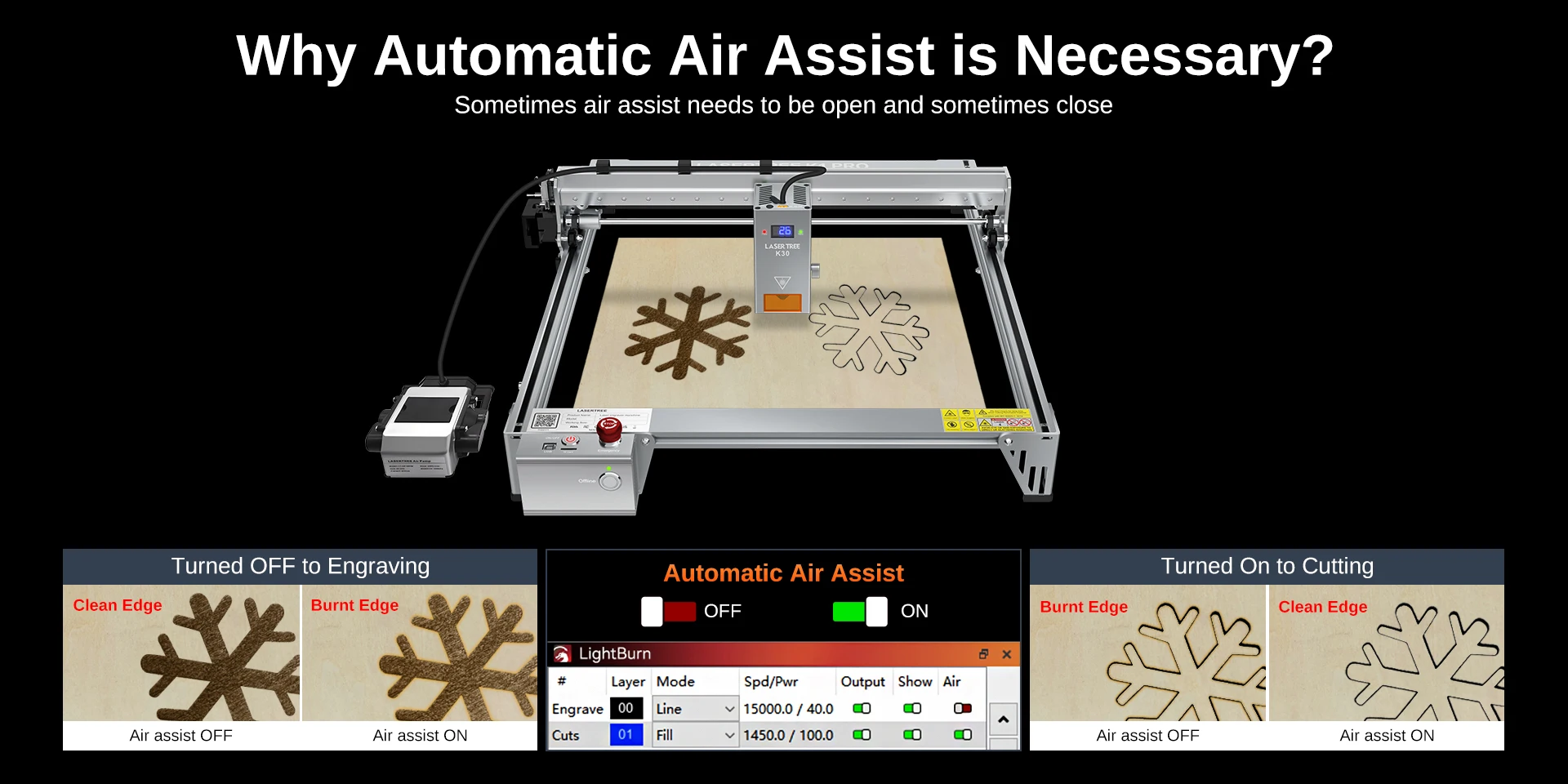 A série K1 PRO está equipada com uma bomba de ar com baixo ruído e fluxo de ar ≥26L/min, e pode controlar de forma inteligente o interruptor de assistência de ar por meio do software LightBurn.