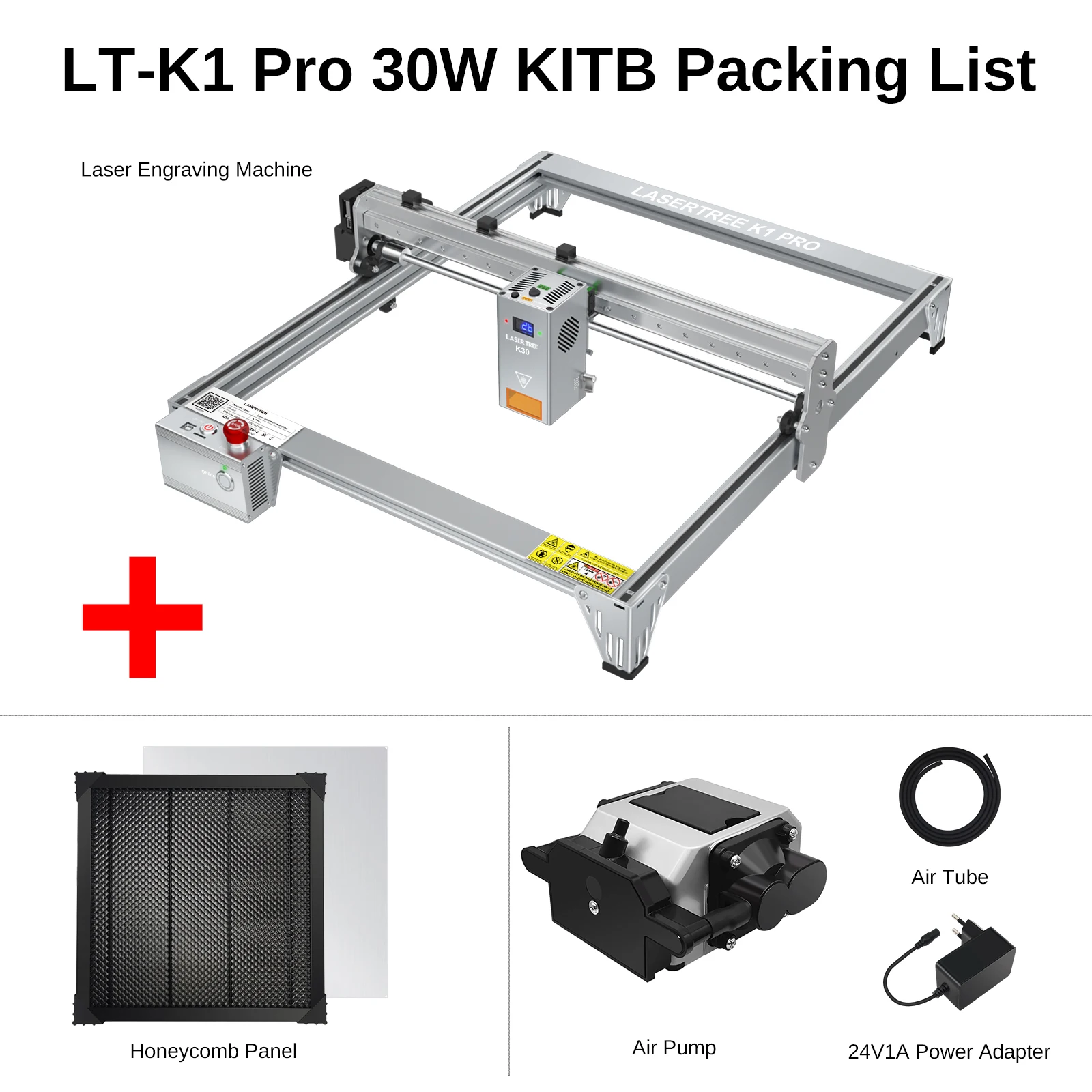 Laser Tree K1 PRO oferece um conjunto completo de acessórios - máquina de gravação a laser + cabeça de laser de 30W/40W(KIT: + bomba de ar + placa de trabalho), (KITB: + bomba de ar + placa de favo de mel)