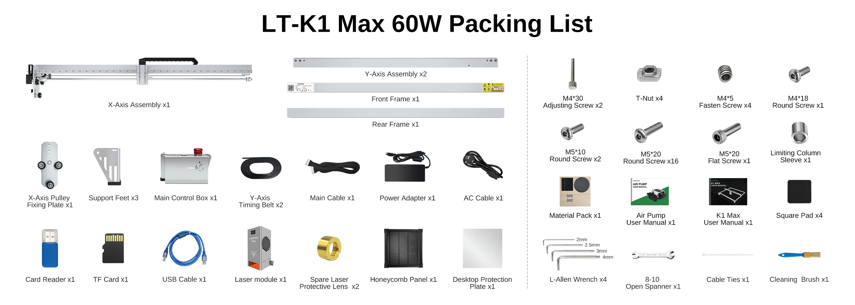 Características do LT-K1-MAX-60W: ① Com 60W + módulo óptico do laser do poder Área do ② Working: 800*600mm ③ X-eixo Linear Slide Design ④ TF cartão Osline gravura Precisão Gravura do ⑤: 0.01mm Velocidade Ultimate: 20000 mm/min Com fio harness armazenamento clip Assistência automática a ar Exposição & função do alarme da temperatura