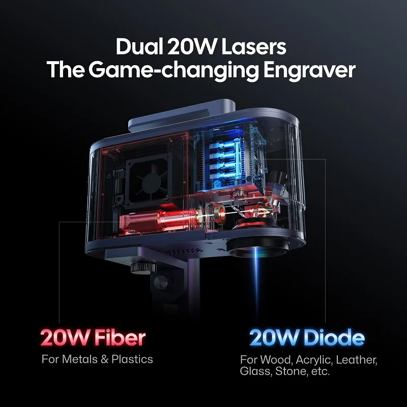 2: A primeira tecnologia de laser duplo do mundo: O laser infravermelho grava instantaneamente aço inoxidável/plástico etc.; o diodo corta madeira de 8 mm/acrílico de 5 mm sem troca manual. Supera máquinas com unidade de laser único em 200%.