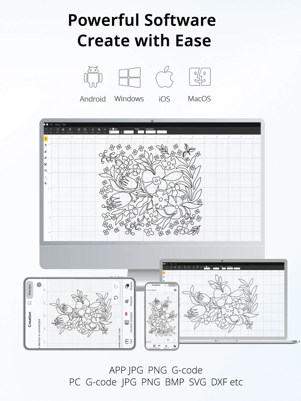 • Support document format: JPG/PNG/Gcode/SVG/DXF