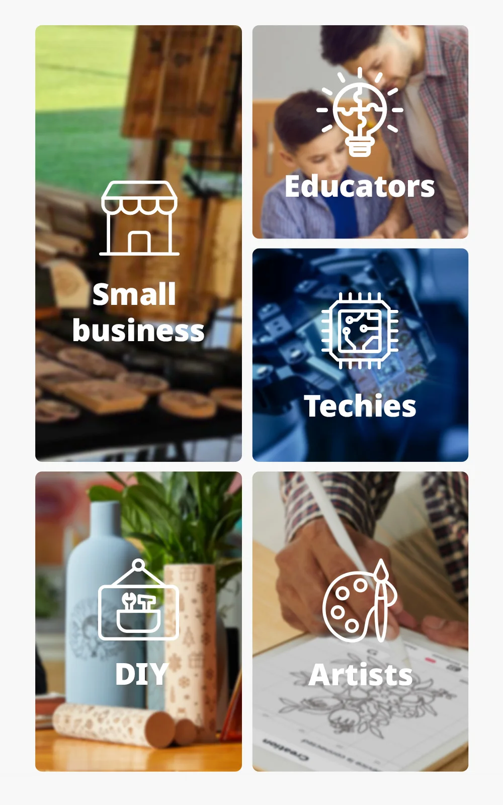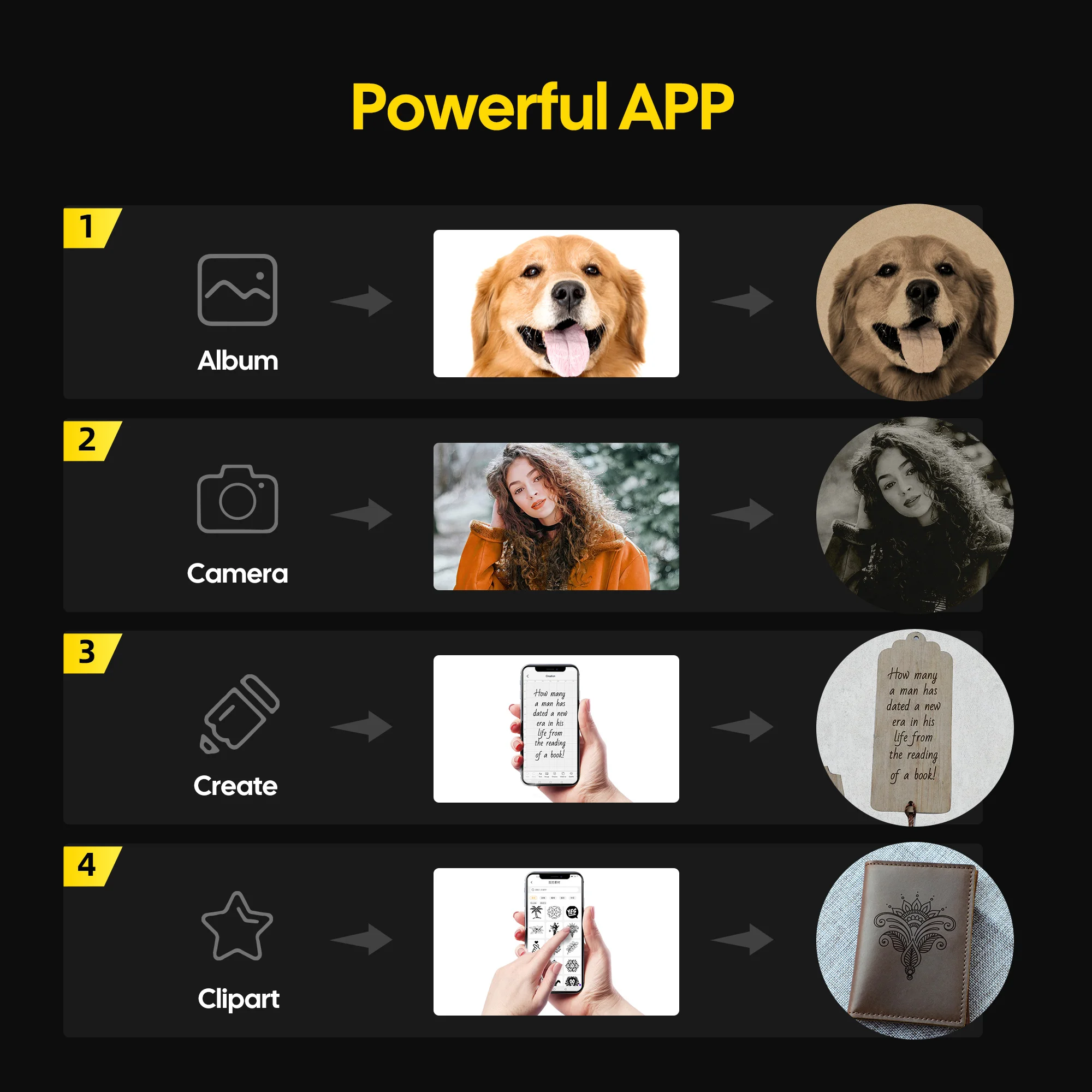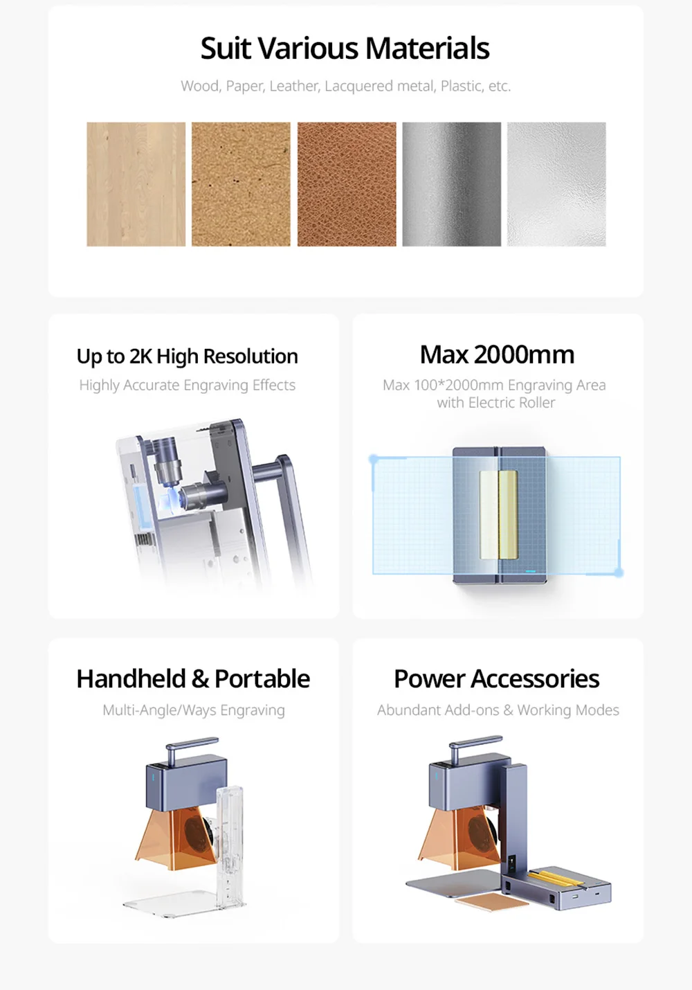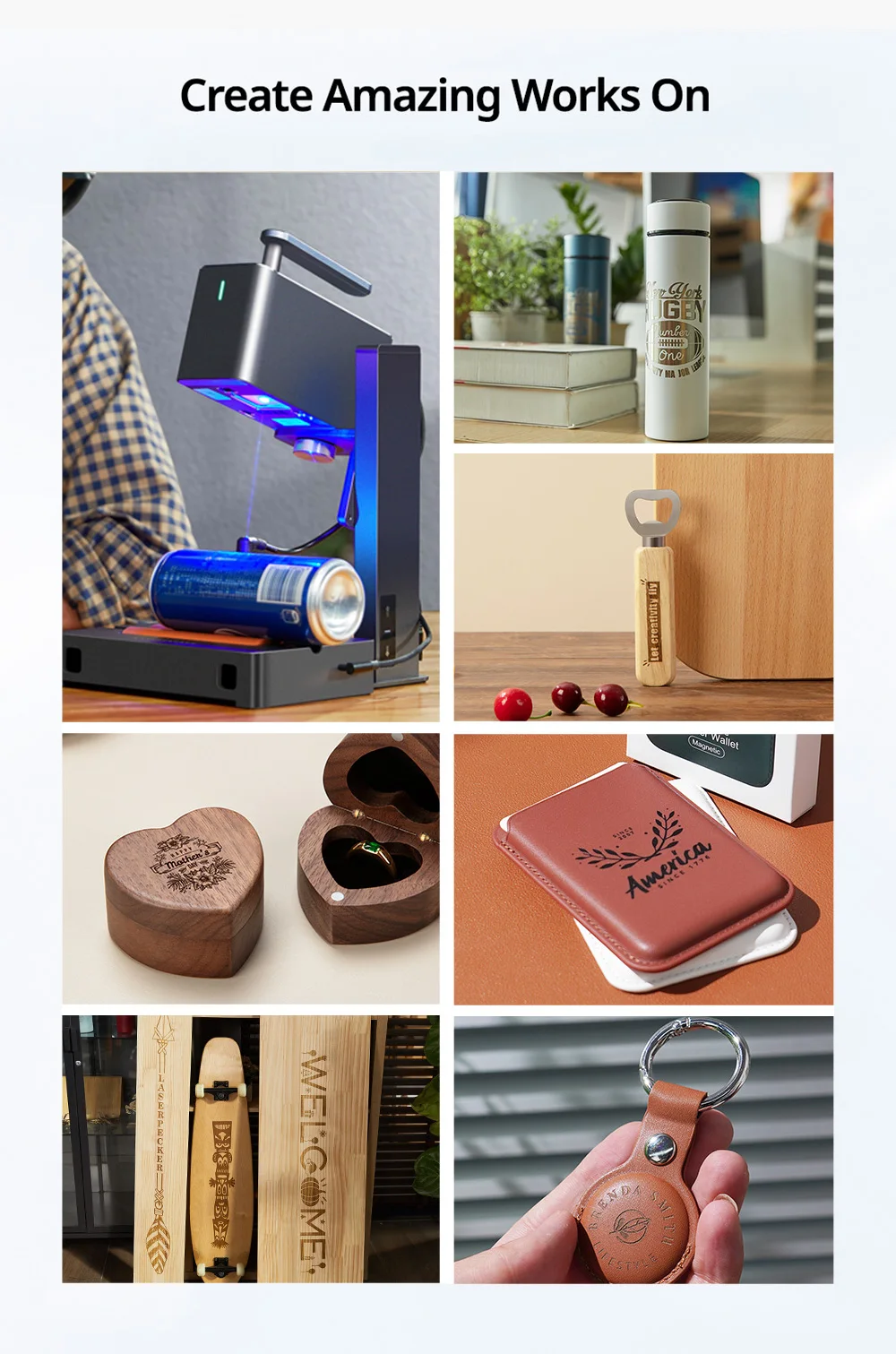 • Materials For Engraving: Wood/bamboo/Paper/leather/drapery/plastic/acrylic/fruit/cake etc