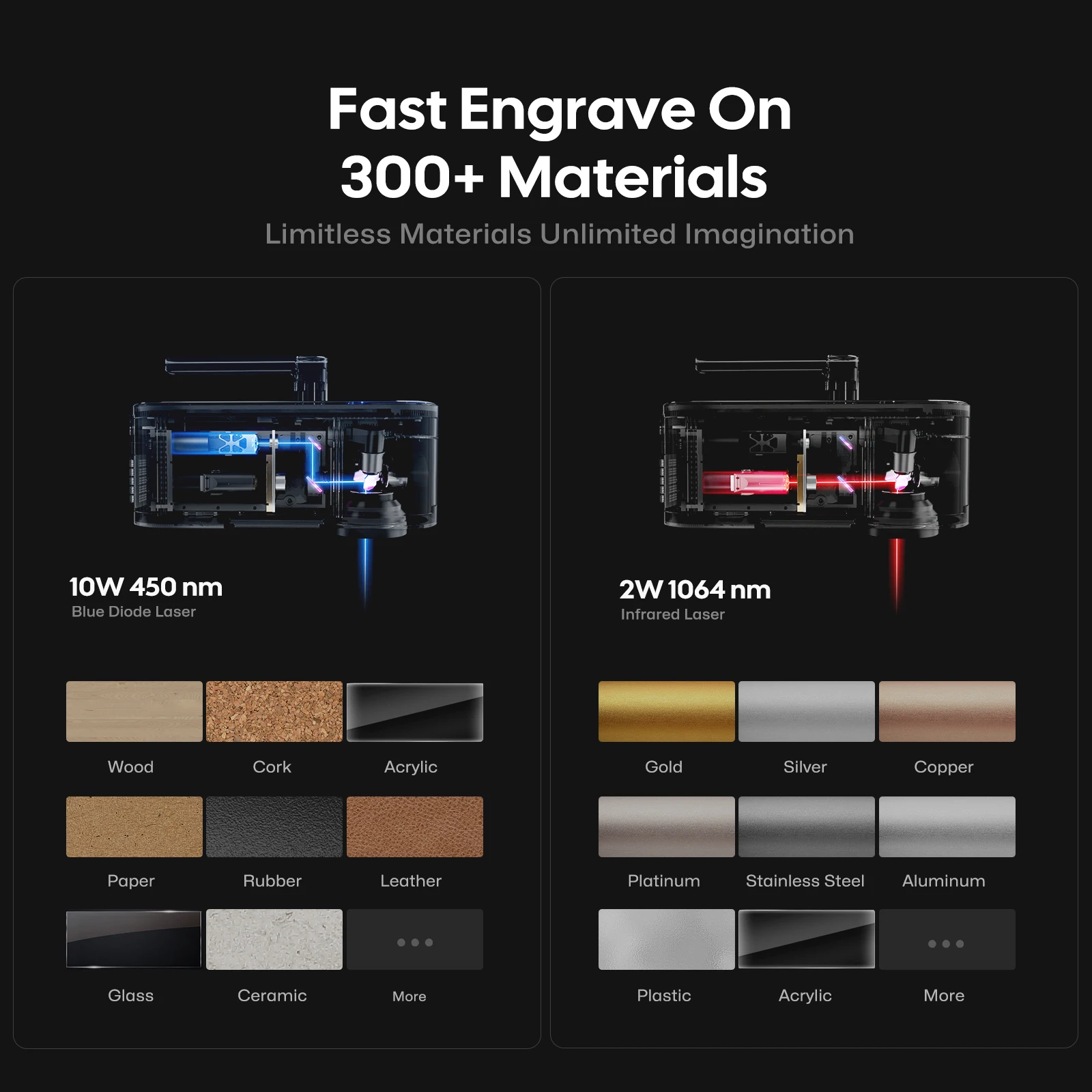 - Applicable Materials: 10W 450nm Blue Diode Laser: Lacquered metal, Anodized aluminum, 304 stainless steel, Bamboo, Wood, Leather, Food, Paper, Fabric, Photosensitive printing, Plastic, Acrylic, Tinted glass, Color glaze ceramics, etc. 2W 1064nm Infrared Laser: Metal, Plastic, Leather and any material with paint coating