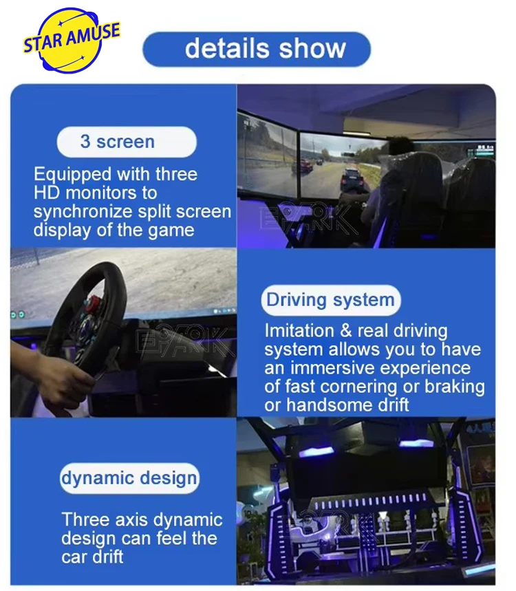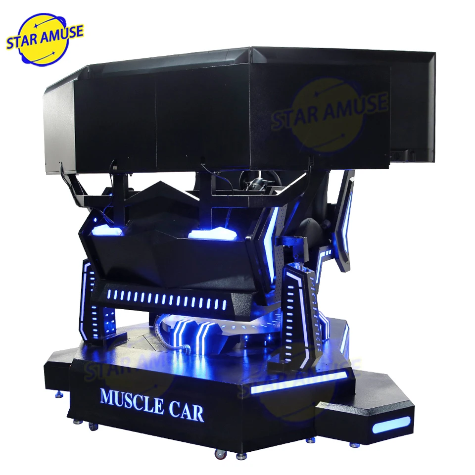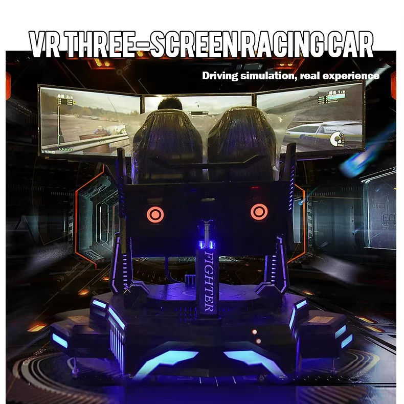 Máquina de corrida VR interna de 3 telas Simulador de 2 lugares e 3 DOF com volante de metal Simulador de movimentação de jogos de carro de corrida de três eixos