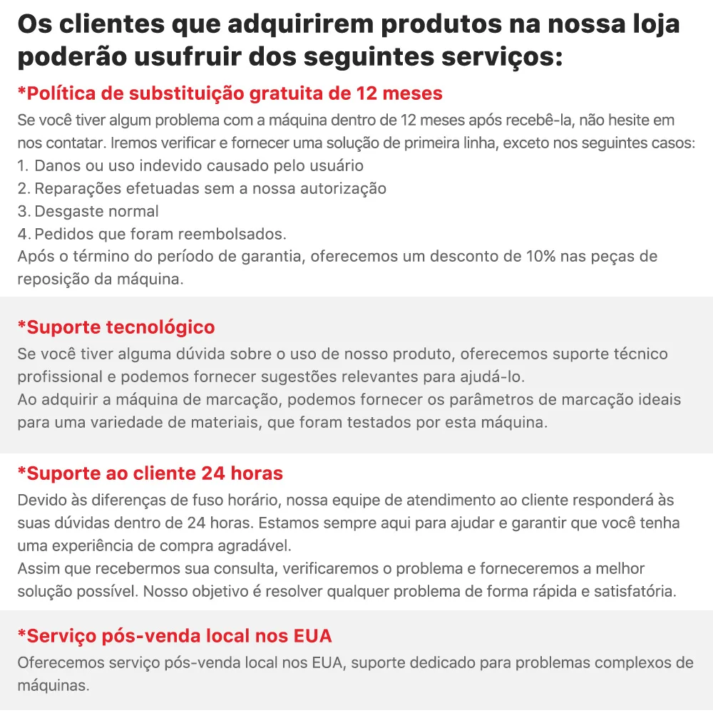 Após o término do período de garantia, oferecemos um desconto de 10% nas peças de reposição da máquina.