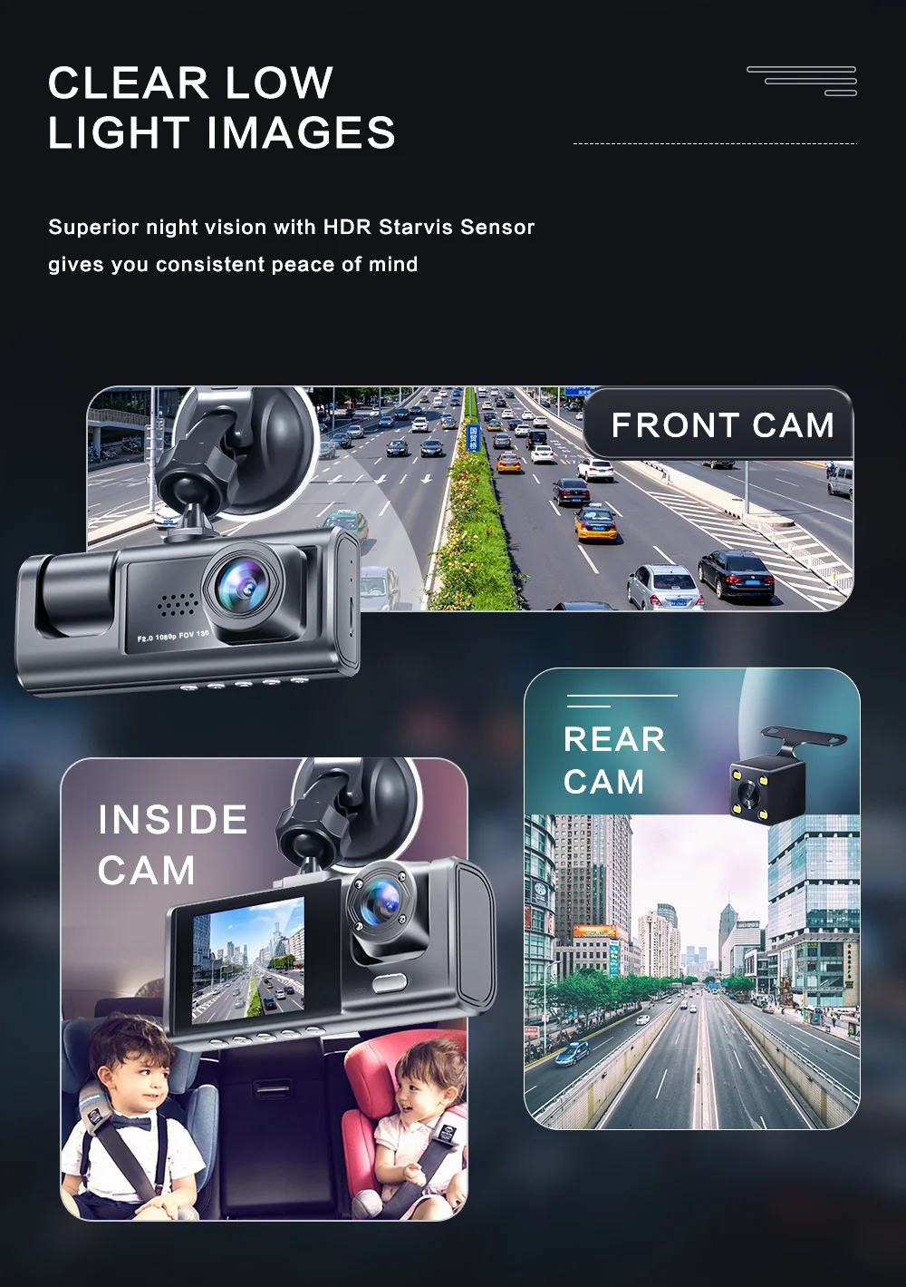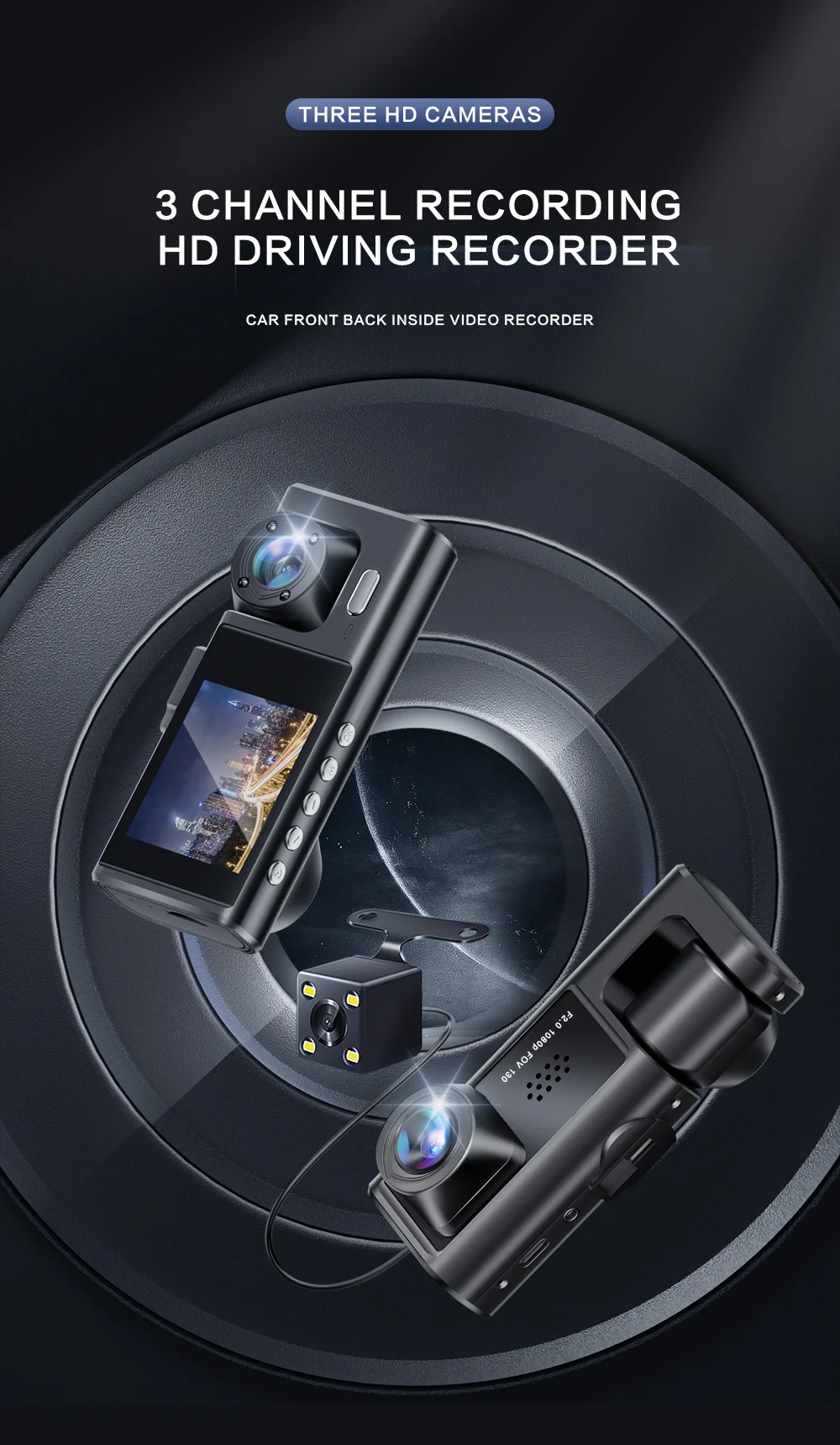 Night Vision Dash Cam com Gravação Loop, Gravador DVR, Gravador de Vídeo, Veículo DVR, 2 “Tela IPS, 1080P, 3 Câmera, IR