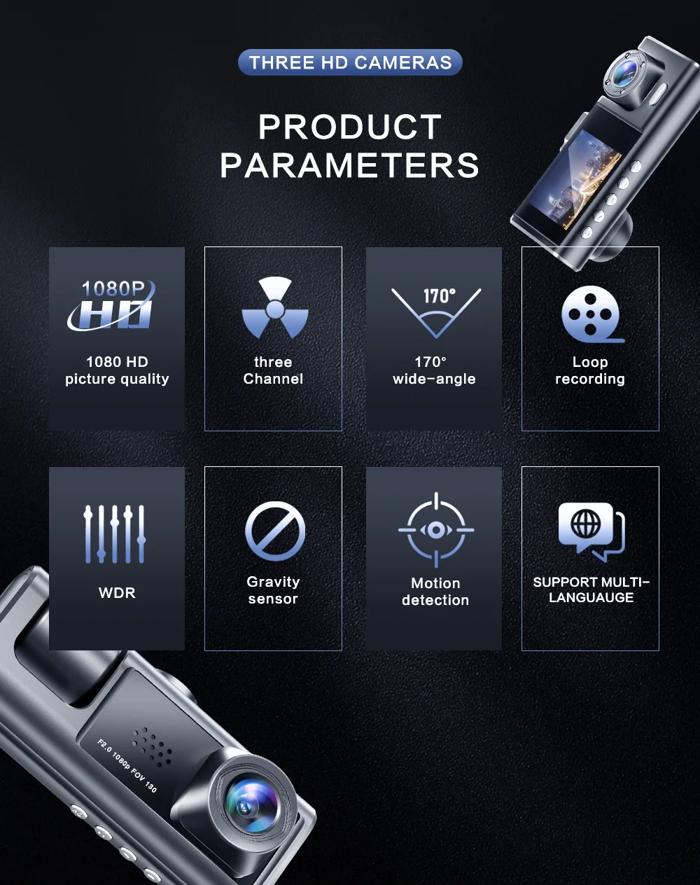 · Câmera de lente dupla: O produto é equipado com três câmeras na frente e dentro do carro, que podem observar exaustivamente as condições da estrada na frente e dentro e atrás.