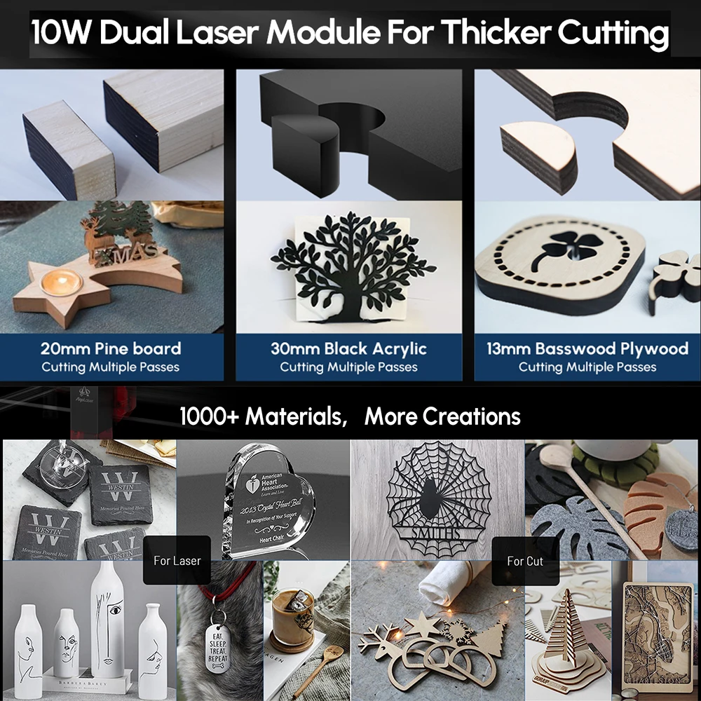 LU2-10A: Gravura mais poderosa com verdadeira potência de saída 10W LU2-10A é recém-atualizado com um módulo laser 10W, o que torna a velocidade de corte até 15.000 mm/min. O ponto comprimido é 0.05mm x 0.1mm. O poder ótico alcança a 10W. Pode cortar 30mm acrílico e 20mm madeira. Ao mesmo tempo, o módulo laser da máquina de gravação possui uma interface de assistência a ar embutida, projetada para corte.