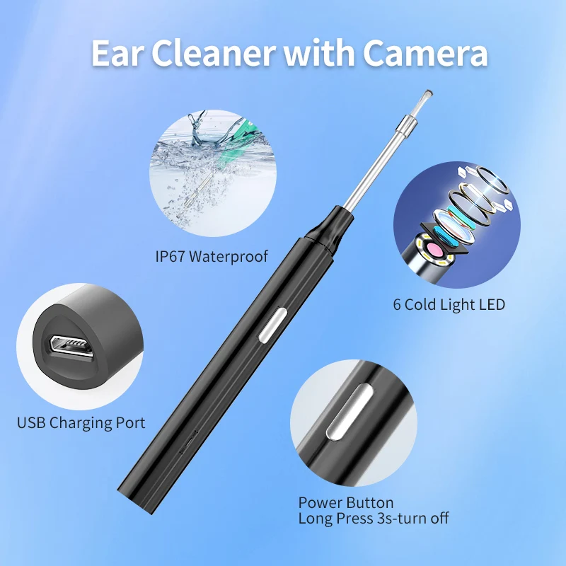 5.[Câmera auricular HD 1080P]:A ferramenta de remoção de cera de ouvido está equipada com uma câmera HD 1080P e 6 luzes LED de alto brilho permitem remover a cera de ouvido com segurança e eficácia, fornecendo uma visão clara do canal auditivo.