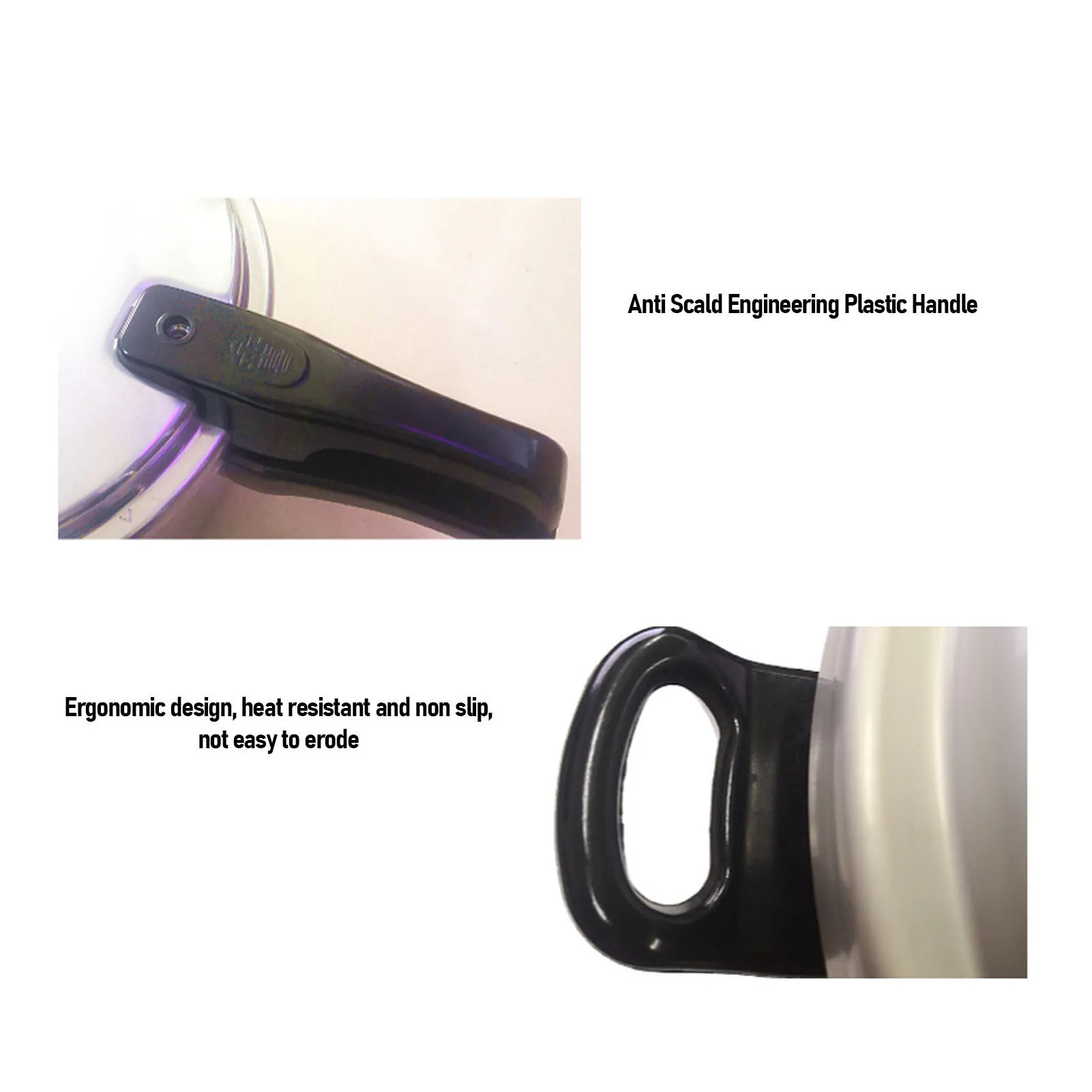 4.Operação fácil de usar: cuidadosamente projetada para maior conveniência, a panela de pressão possui um mecanismo de travamento fácil de usar que simplifica o processo de abertura e fechamento.Isto melhora a experiência geral do usuário, garantindo que cozinhar seja fácil e acessível para todos.