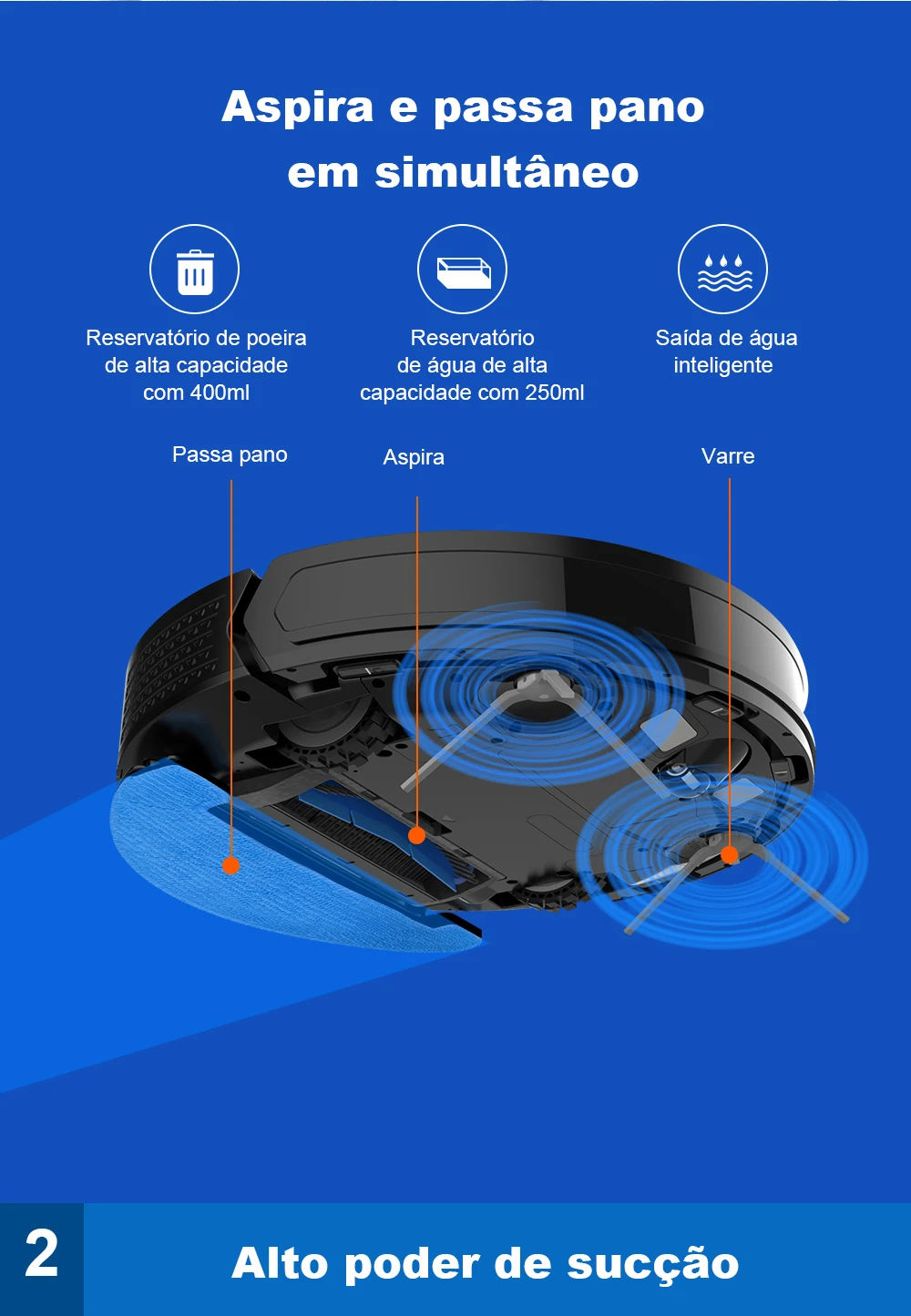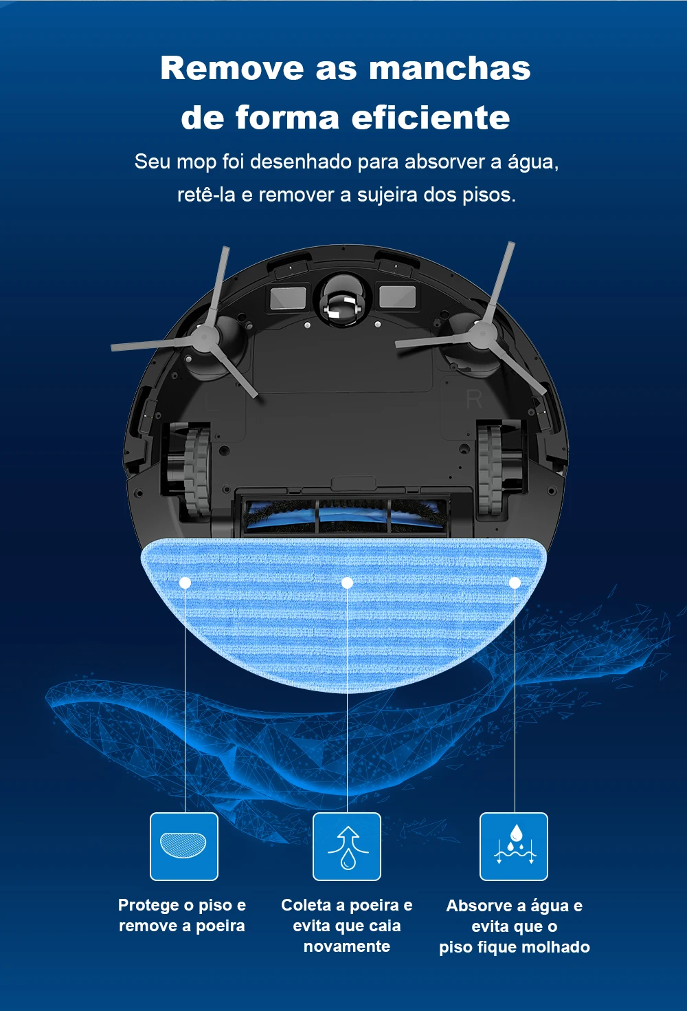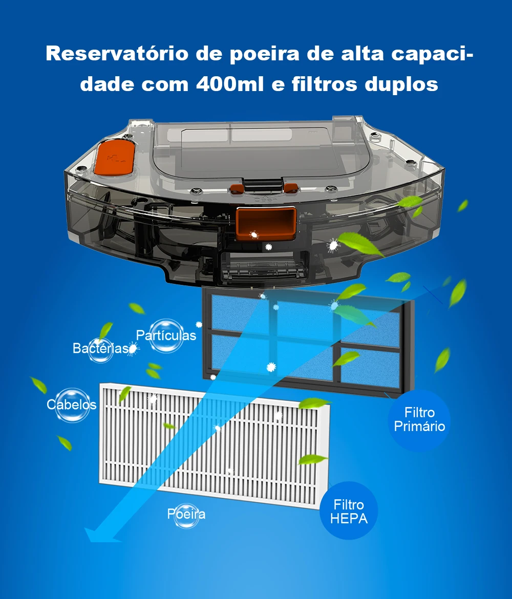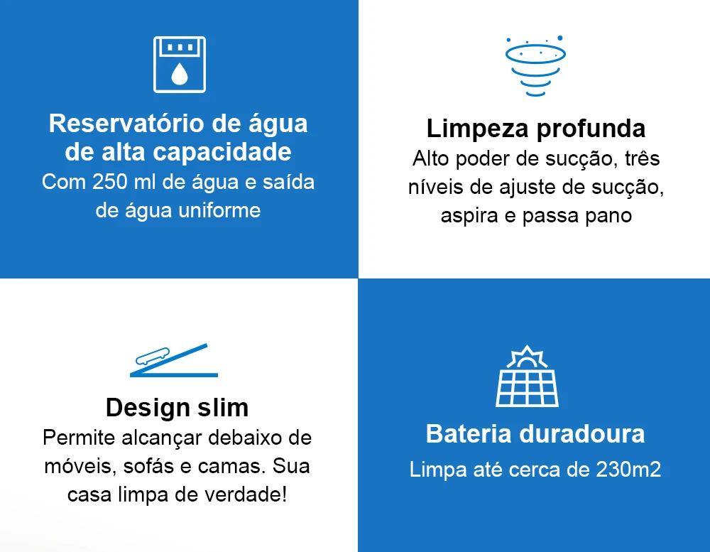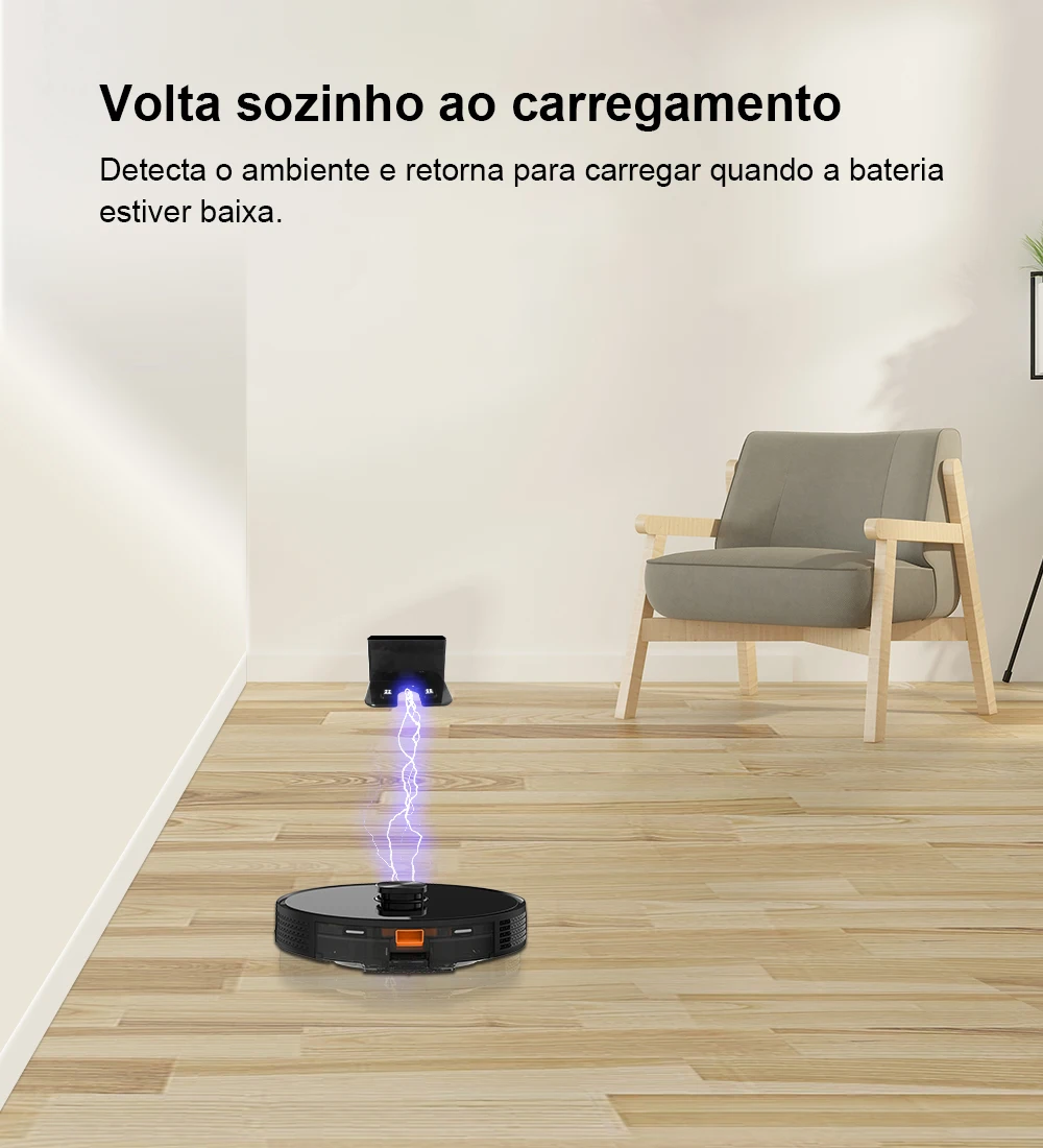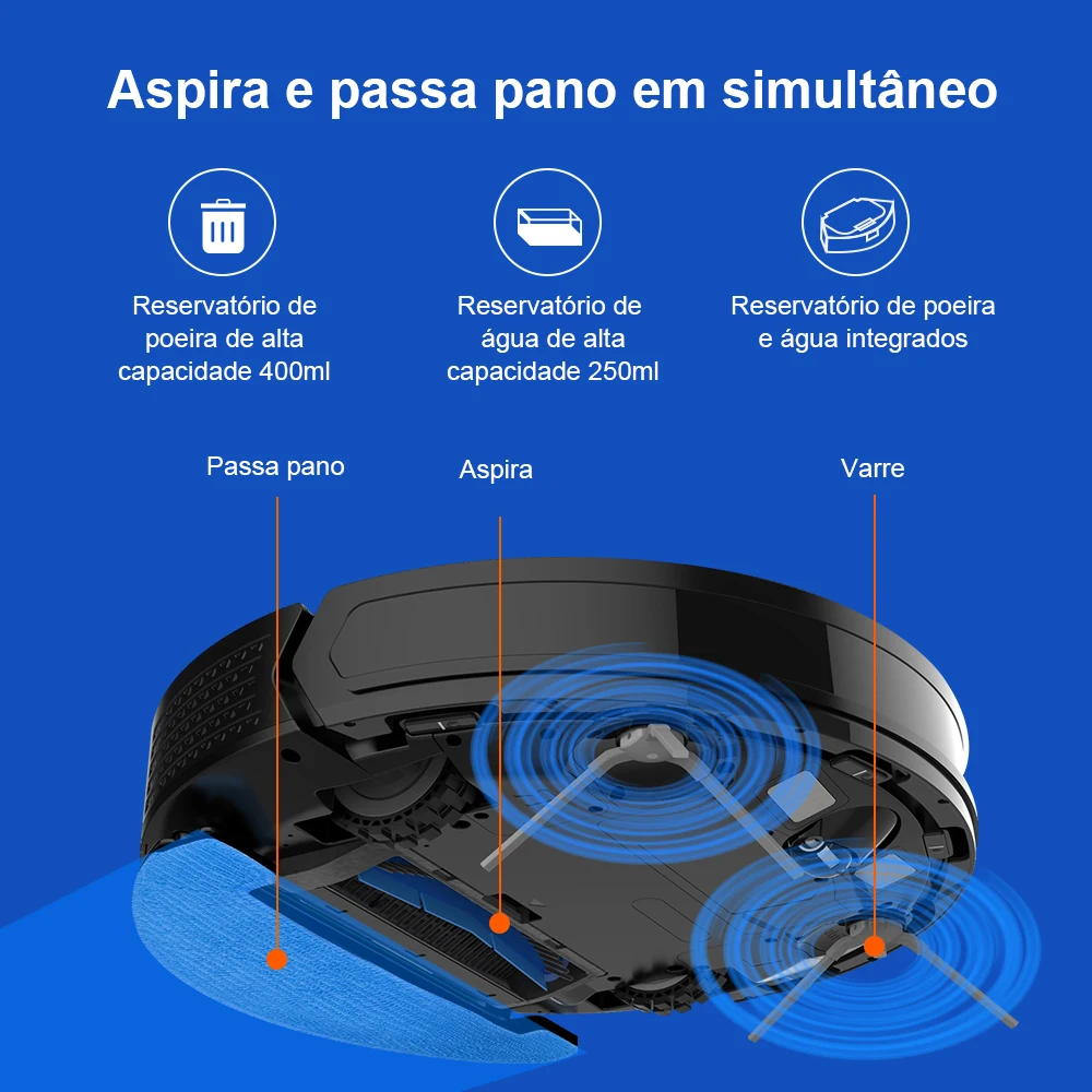 Com ele, você pode varrer, aspirar e passar pano automaticamente, deixando seu ambiente verdadeiramente limpo e renovado em instantes.