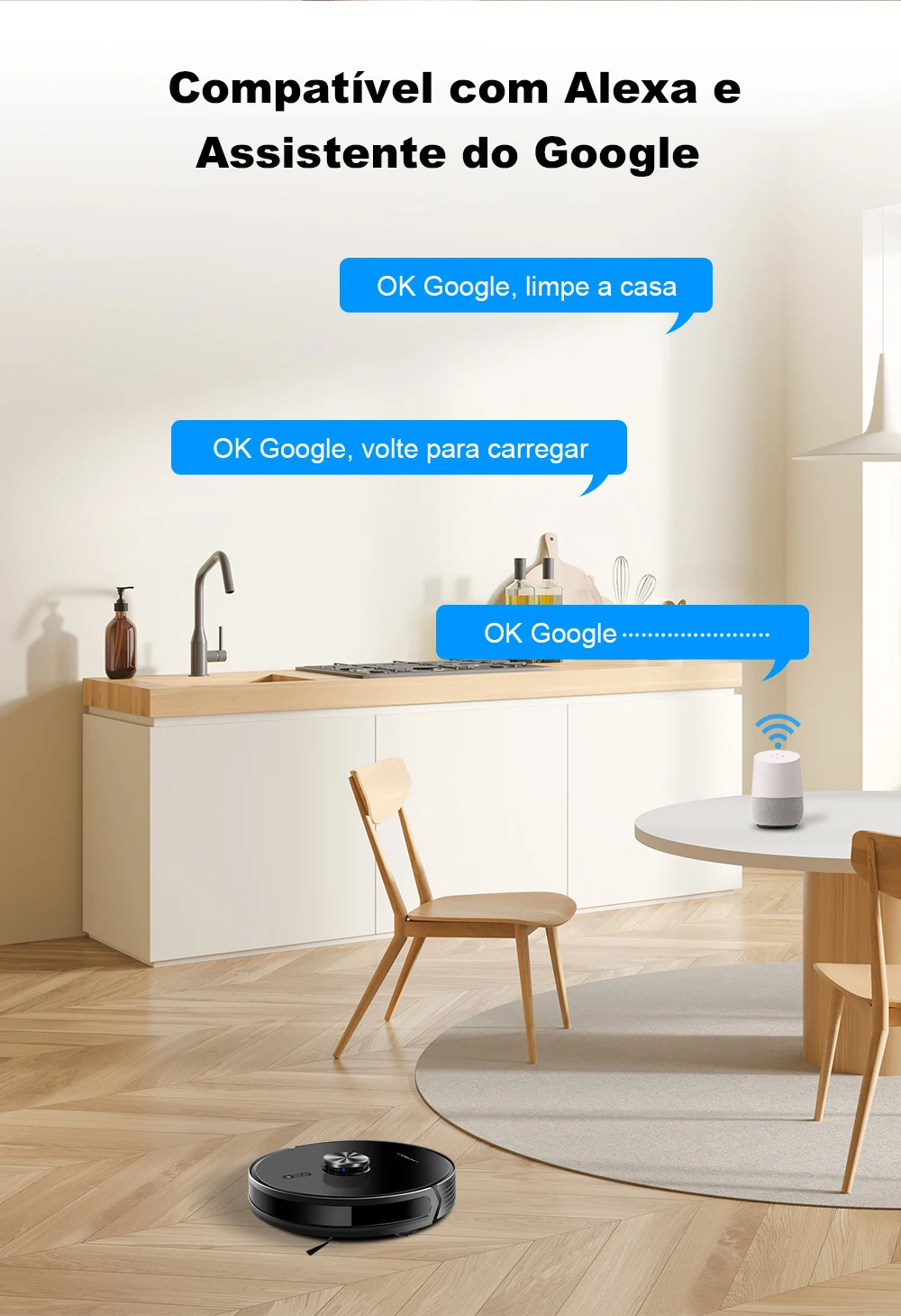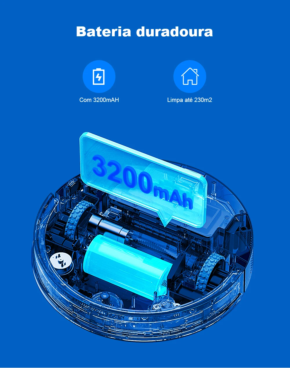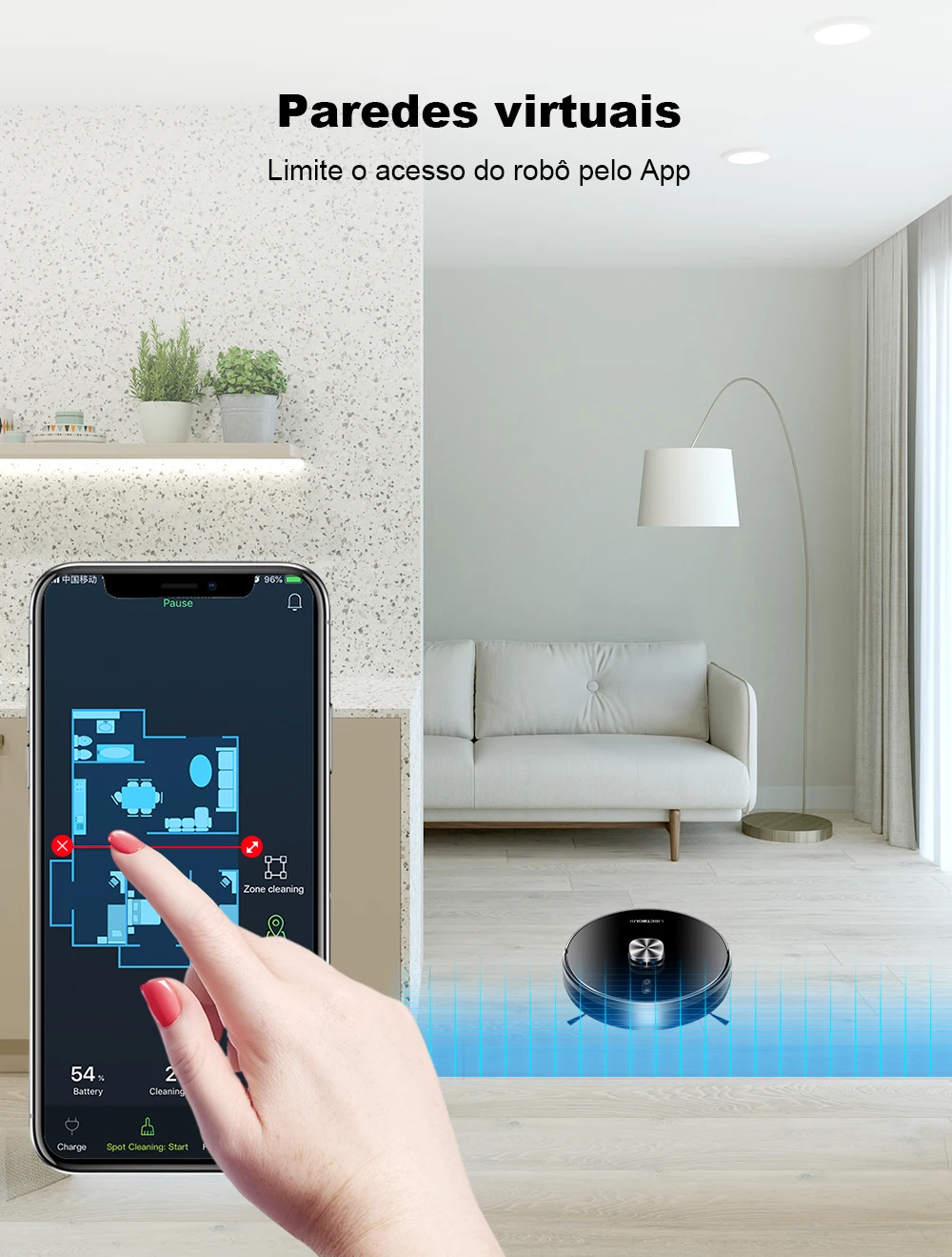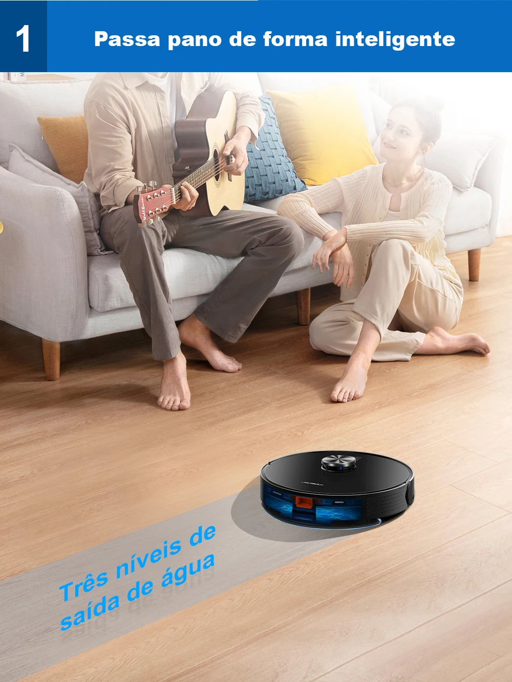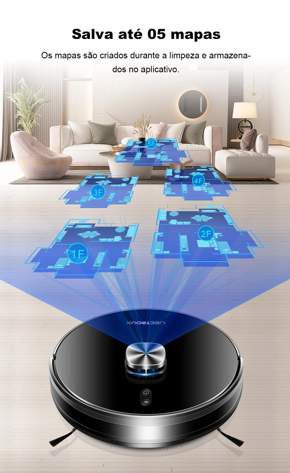 Com ele, você pode varrer, aspirar e passar pano automaticamente, deixando seu ambiente verdadeiramente limpo e renovado em instantes.