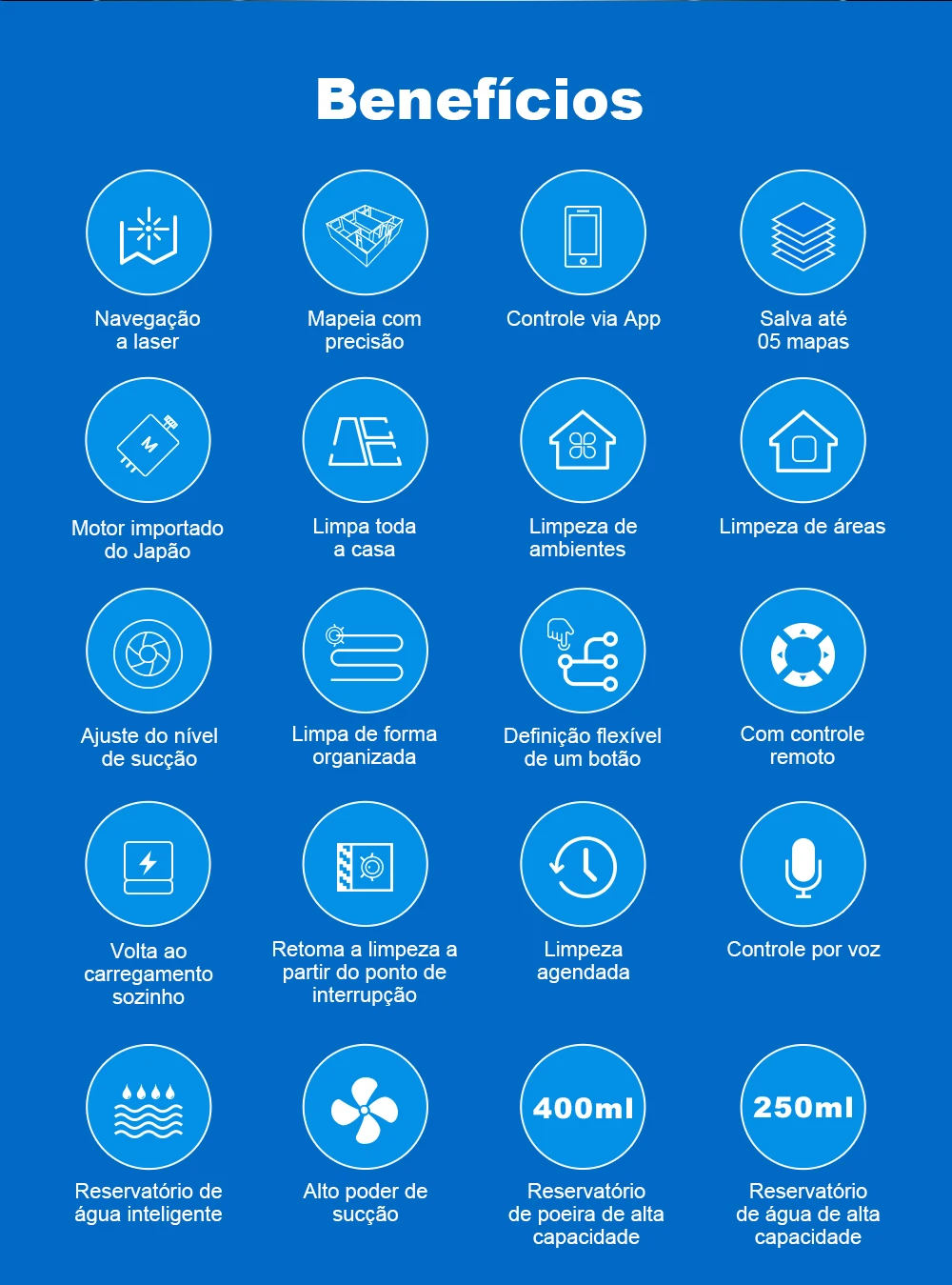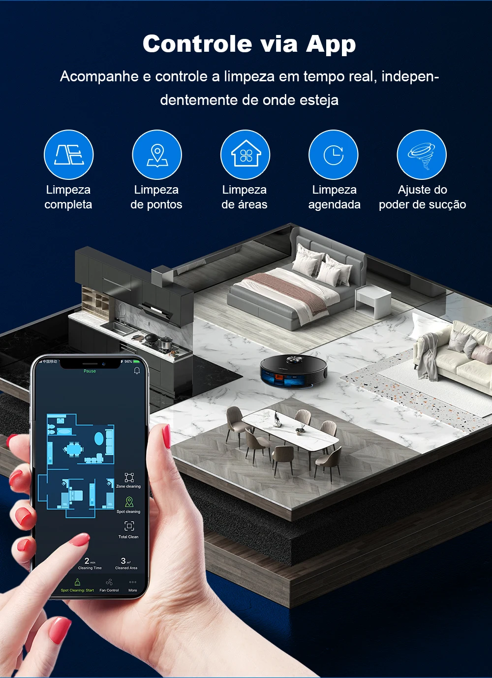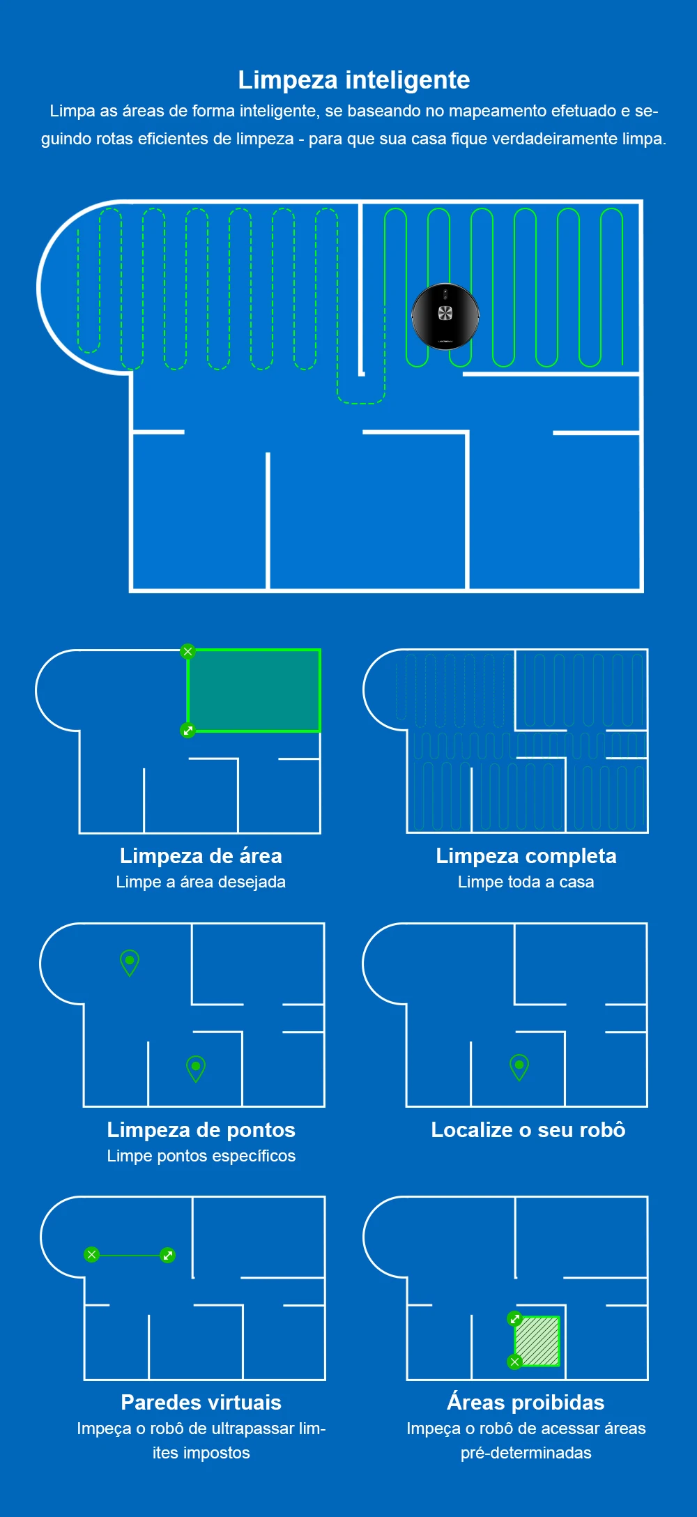 - Modos de limpeza - Limpeza total / Limpeza de ambientes / Limpeza de áreas / Limpeza de pontos