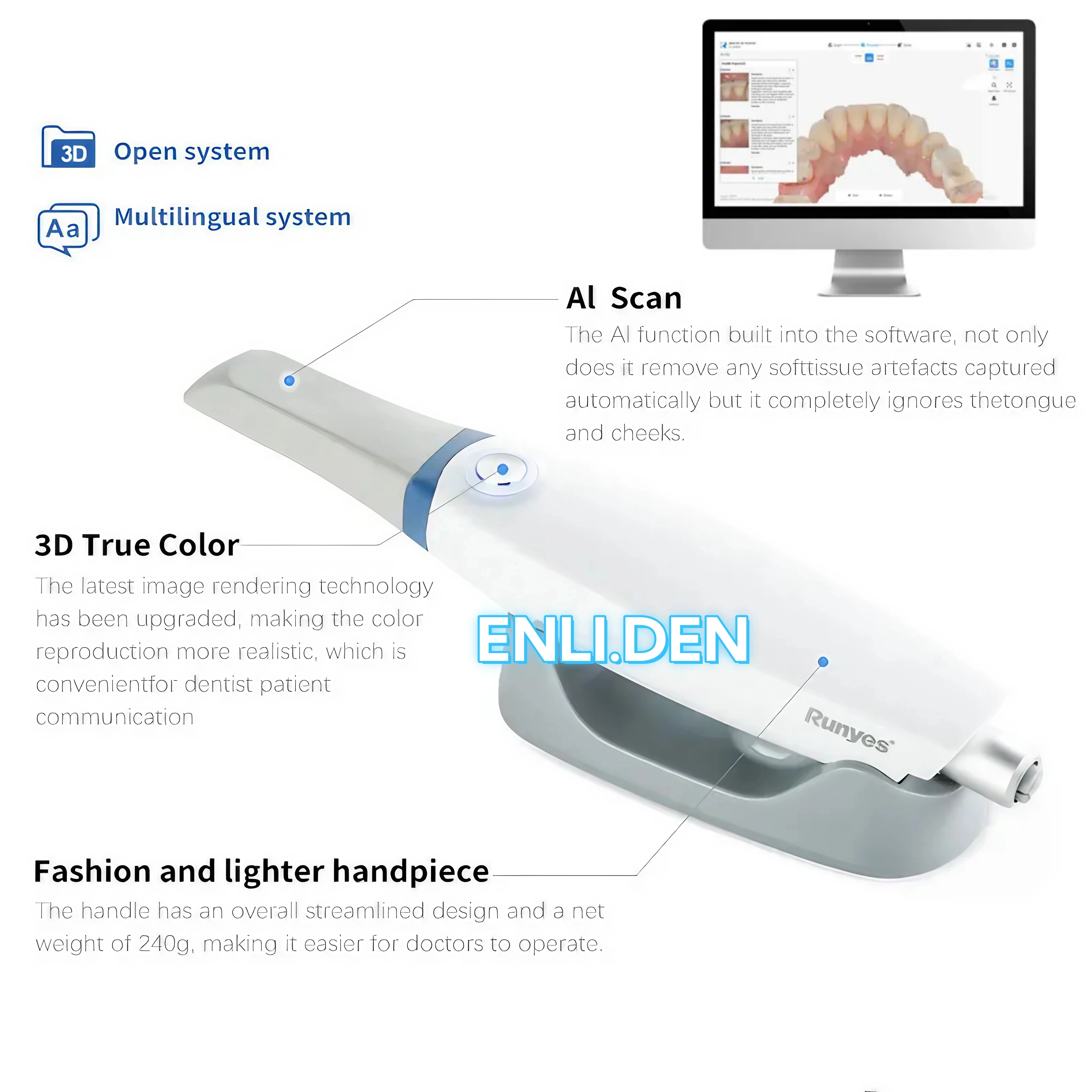 A nova ponta do scanner com sistema de aquecimento interno mantém a temperatura dentro da boca do paciente constante. O ângulo do espelho da ponta do scanner é próximo a 45 graus e pode digitalizar as áreas mesial e distal em linha.
