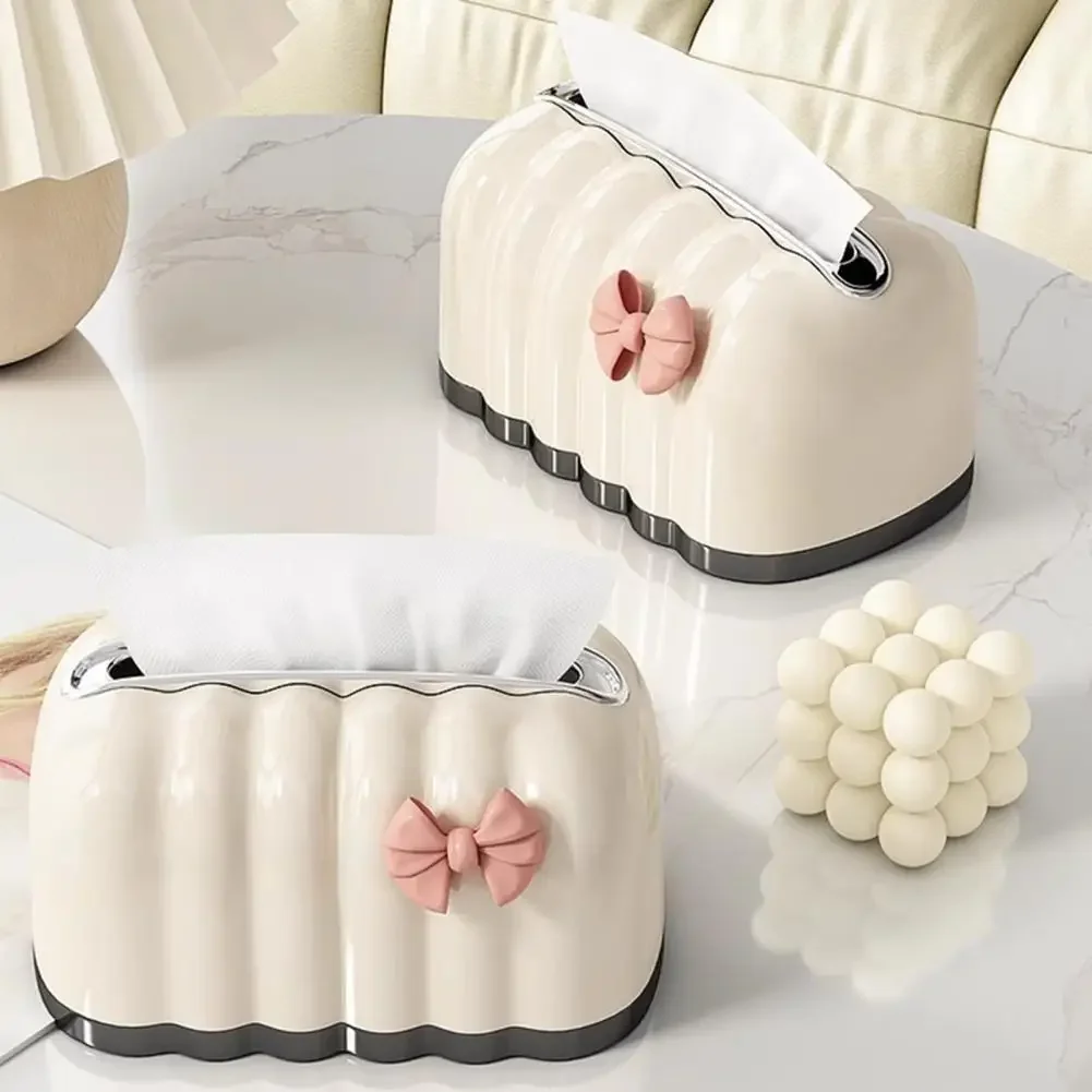 Decorative Tissue Box Cover with Pink Bow Large Capacity Automatic Lifting Spring Tissue Box Desktop Wipes Holder