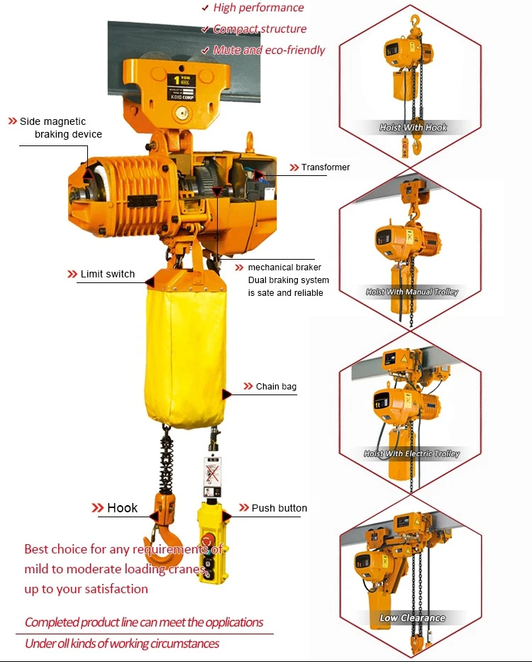 2. Capacidade de talha de corrente elétrica de 500kg a 30T, tipo gancho ou tipo trole.
