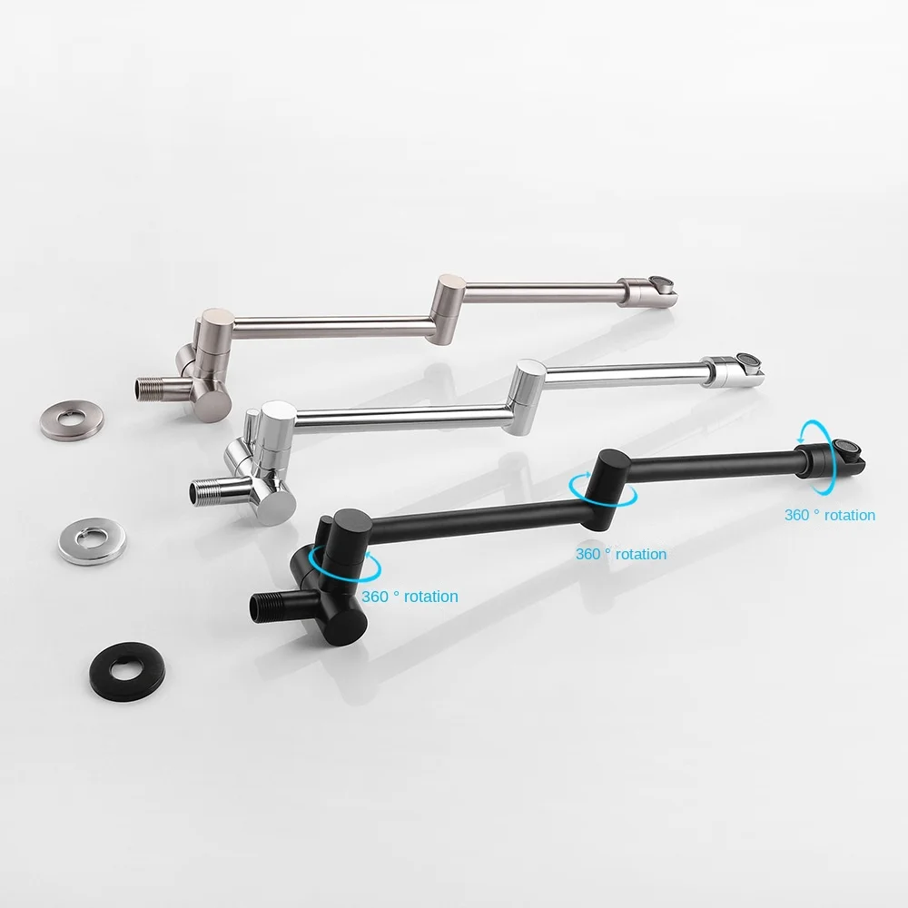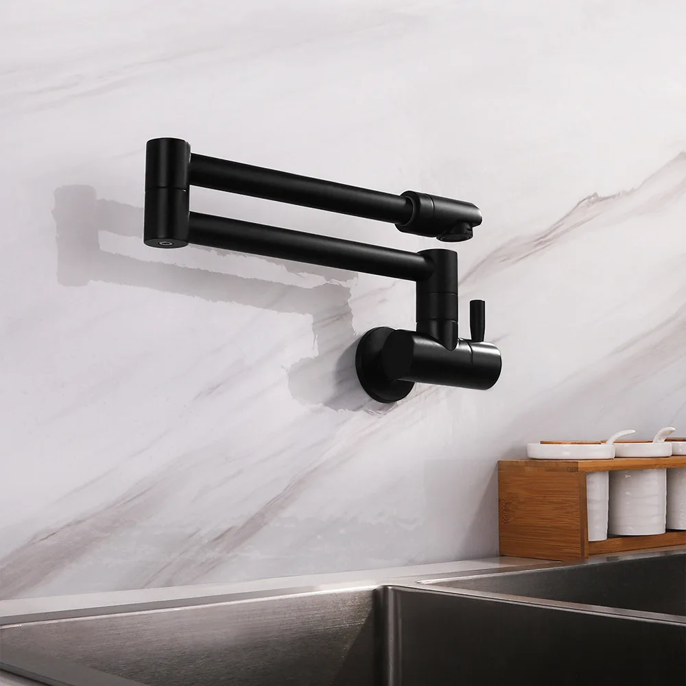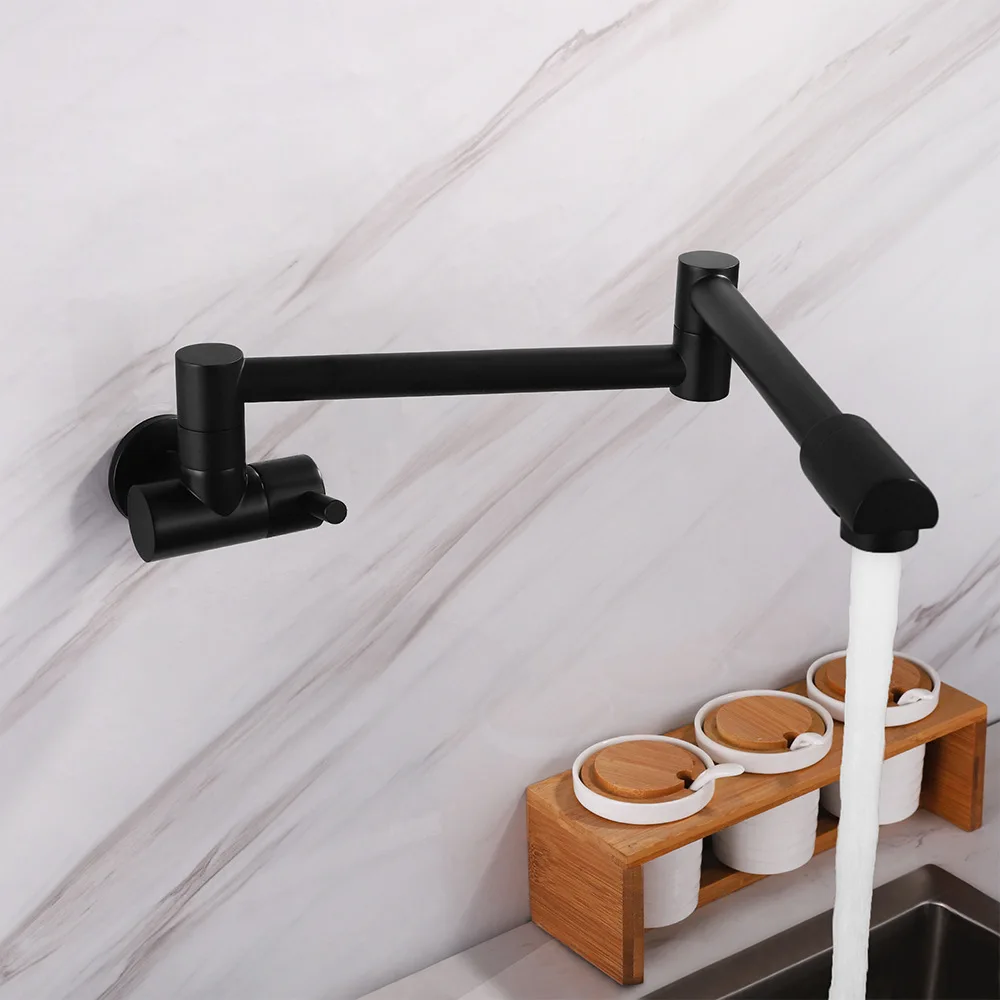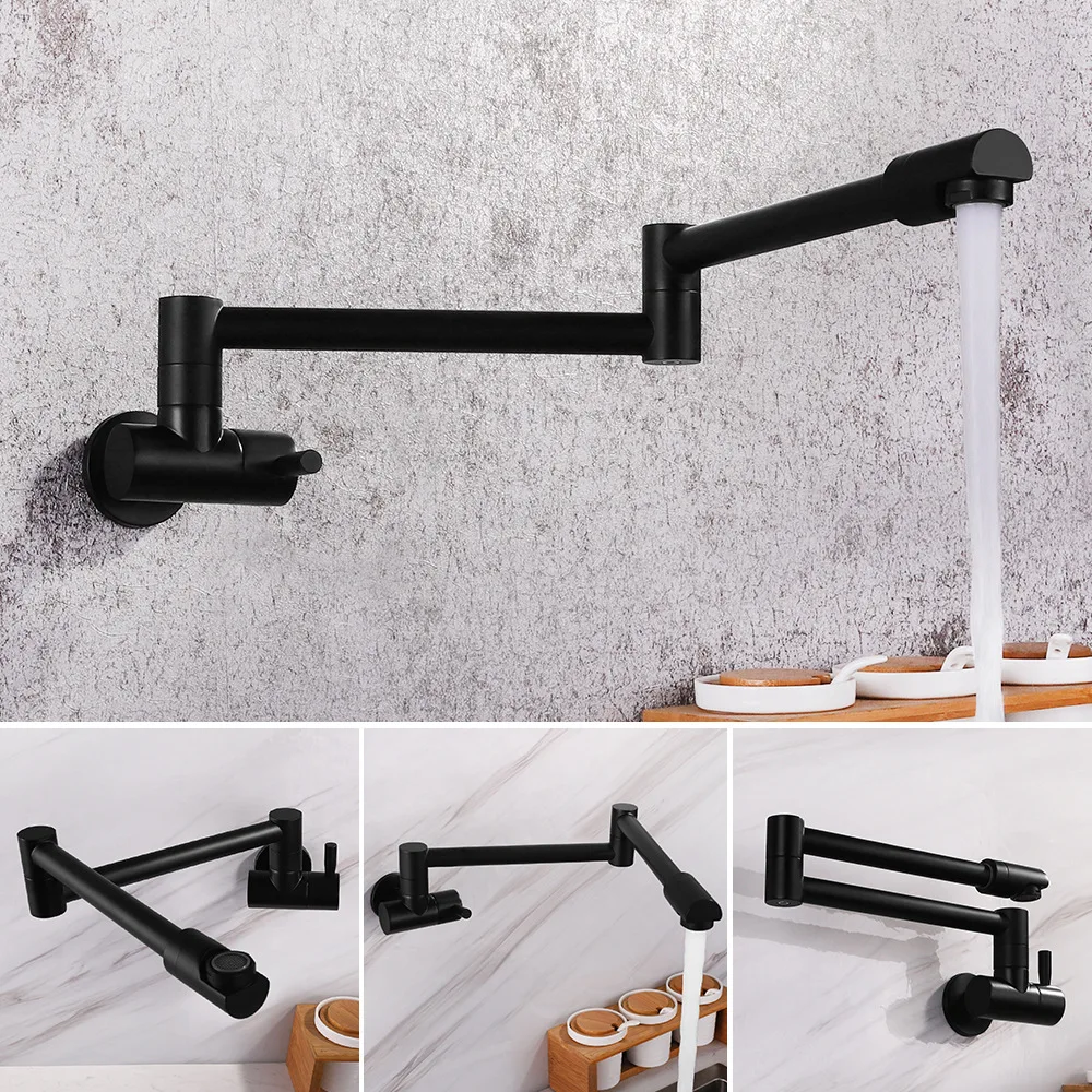 Torneira de cozinha dobrável de parede toda em cobre 360 ° Rotação única fria preta escovada torneira de enchimento de pote braço oscilante furo único