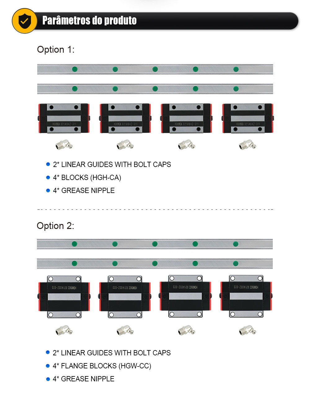 Seja o primeiro a avaliar “Trilhos lineares enviados no Brasil HGR20 2 unidades + 4 unidades HGH20CA rolamentos blocos lineares para roteador CNC”