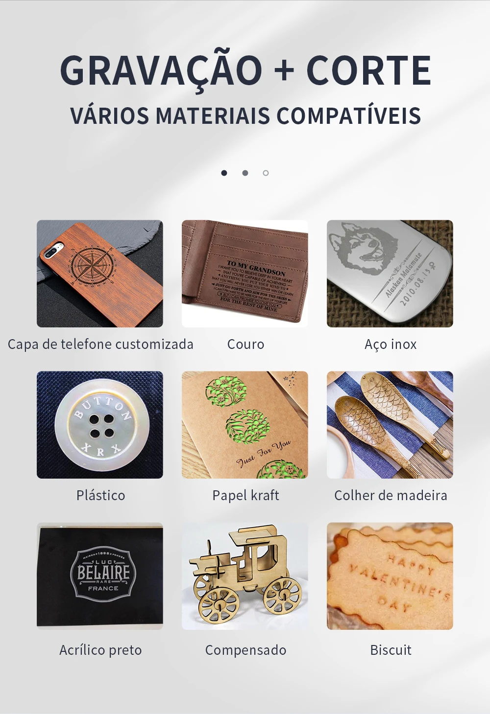 Materiais aplicáveis: madeira, pano, couro, plástico, alumínio, aço inoxidável, etc.
