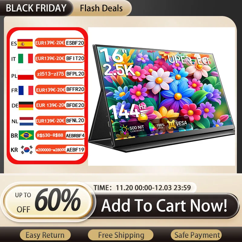 UPERFECT 2K 16inch Portable Monitor 144Hz 400Nit With VESA Display Gaming Screen For Xbox PS5 Phone Computer Extension Office