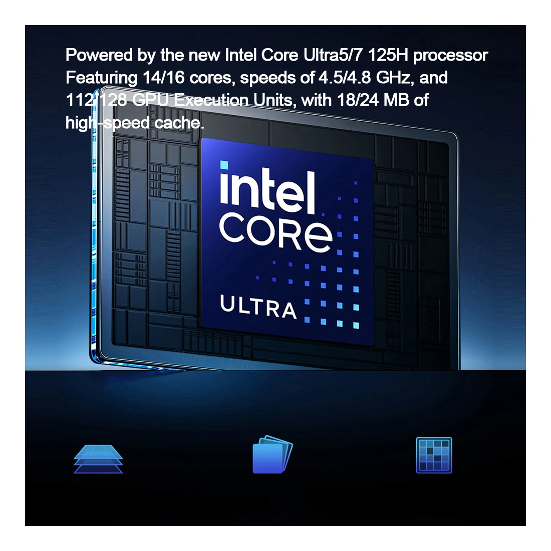 3. Alimentado pelo novo processador Intel Core Ultra5/7 125H com núcleos de 14/16, velocidades de 4,5/4,8 GHz e unidades de execução de 112/128 GPU, com 18/24 MB de cache de alta velocidade.