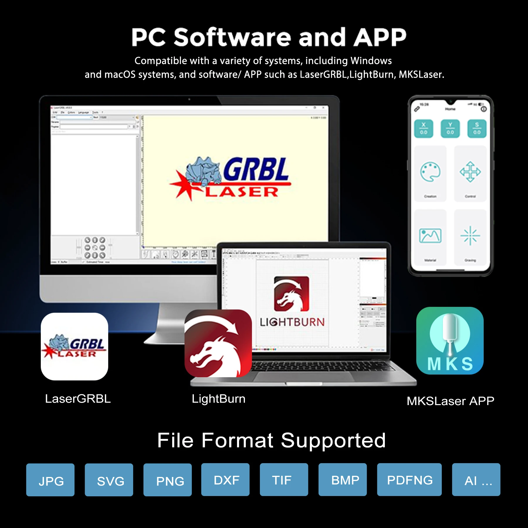 Compatível com uma variedade de sistemas, incluindo sistemas Windows e mac OS, e software como LaserGRBL, LightBurn, MKSLaser.