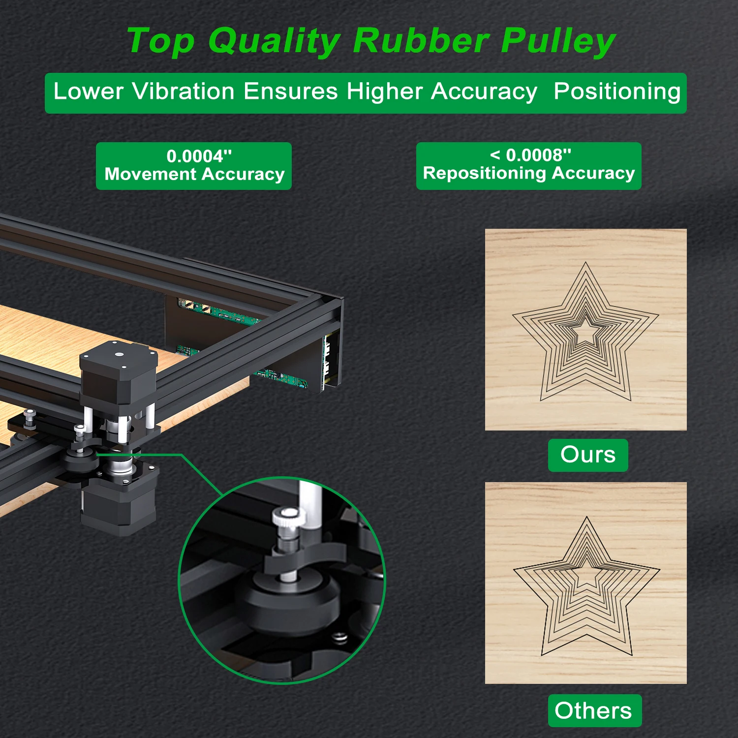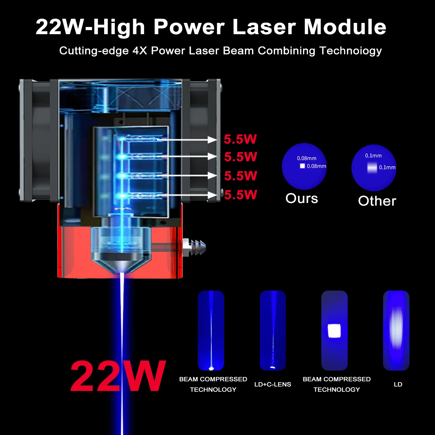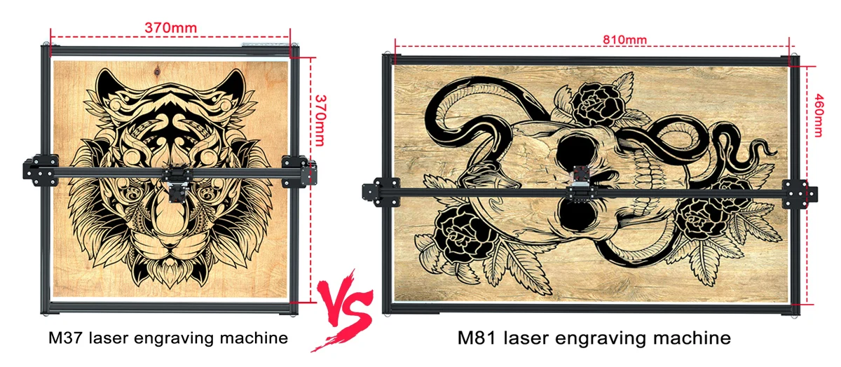 O modelo 80W (saída do laser 10W) suporta mais materiais de gravação e corte, tem gravação mais fina e velocidade de gravação mais rápida em comparação com o modelo 40W (saída do laser 5W)
