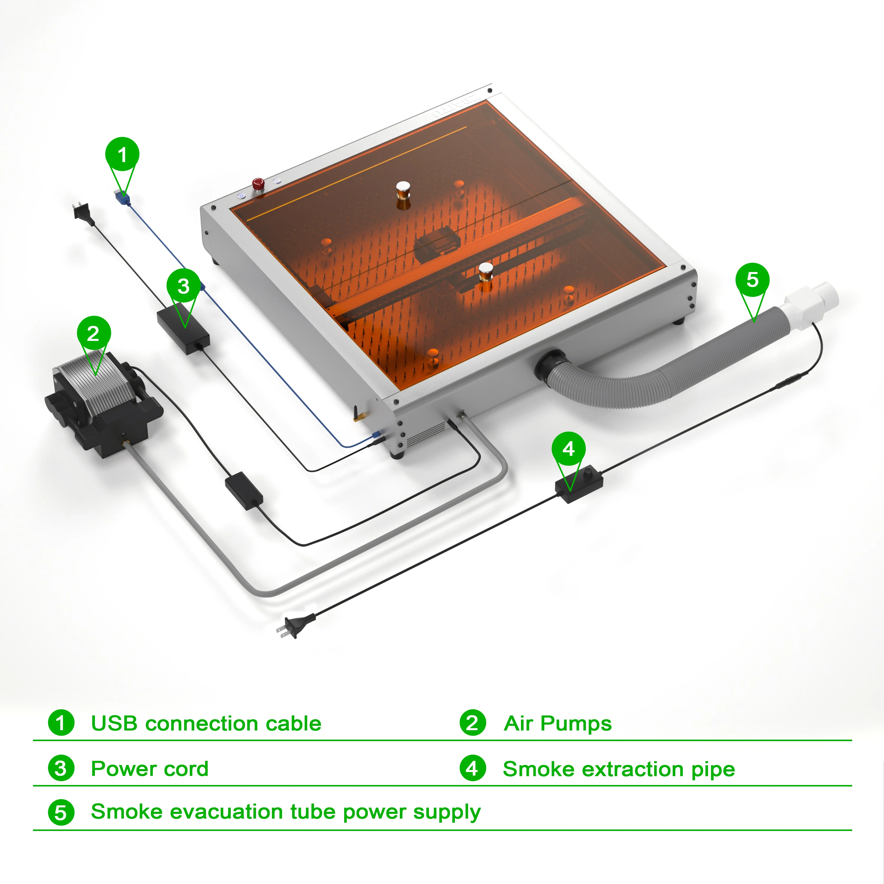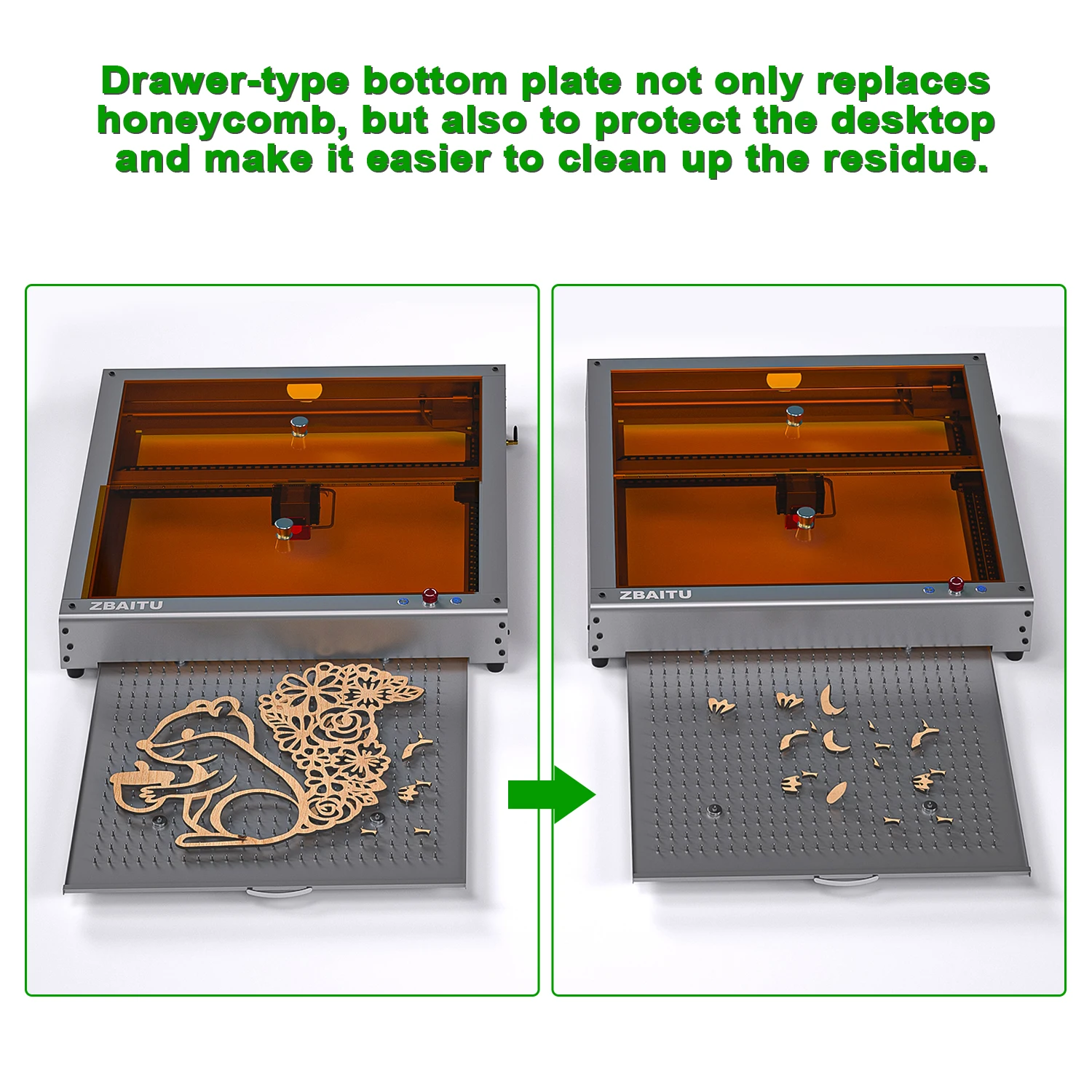 Velocidade de gravação 2.TOP: Velocidade de gravação até 20000 mm/min. É um apoio digno e bom do negócio para que os fabricantes do negócio à produção em massa rápida, e arte-final modelo com dificuldade alta e exigências da elevada precisão. 3. Sistema de exaustão de fumaça independente: Quando você conecta a máquina de exaustão de fumaça e cobre o painel, é uma caixa selada perfeita, e não haverá mais cheiros desagradáveis e fumaça irritante. 4. Vem com uma gaveta-tipo placa inferior, nenhuma necessidade de comprar uma outra placa do favo de mel, pode cortar perfeitamente e proteger seu desktop. O design do tipo gaveta também pode facilitar a limpeza de detritos cortantes. E tem seu próprio ímã, que pode fixar seus materiais do corte. 5. O layout puro do fio, todos os fios é instalado na corrente de arrasto, não haverá mais fios confusos, tubos de ar, tudo se tornará perfeito e amigável de usar. 6. Fácil de instalar, o que você recebe é quase uma máquina acabada, basta seguir o manual de instruções e executar algumas etapas simples para corrigi-lo para concluir a instalação. 7. Segurança, adicionamos uma luz de botão indicadora a ela, que pode estar pronta para informar o status de trabalho da máquina, e é muito firme, desde que seja colocada lá, não será facilmente movido. 8. A placa-mãe da máquina tem um receptor de sinal wifi, o sinal é mais estável, a cobertura é mais ampla, você pode facilmente usar a conexão wifi e não haverá interrupção de sinal. 9. Controle do fluxo de ar pelo software: A fim ao uso mais conveniente, nós adicionamos a função do controle do software do fluxo de ar a esta máquina. Você não precisa mudar manualmente o fluxo de ar, basta clicar no botão na operação do software. Em lightburn, deve ser ligar/desligar conforme necessário.É uma máquina de gravação a laser perfeita ALL-IN-ONE com tudo o que você precisava, tornará sua criação mais fácil, mais limpa, mais rápida e eficiente.