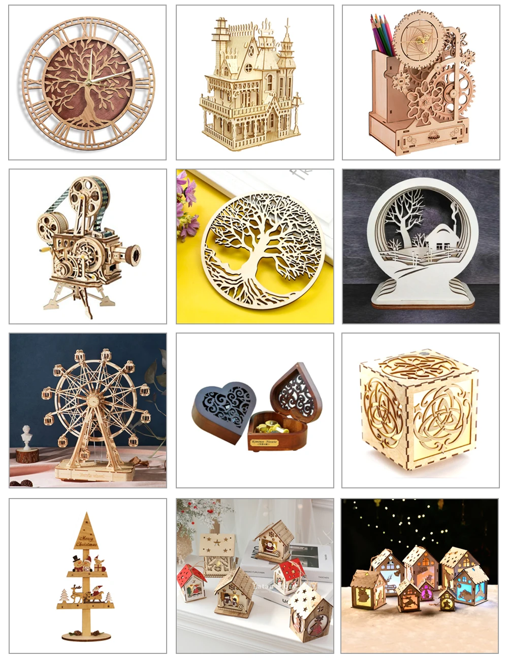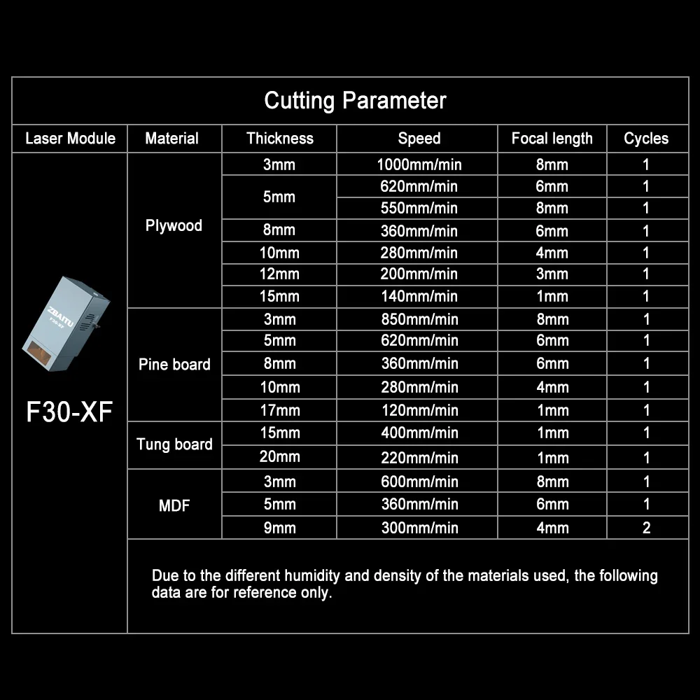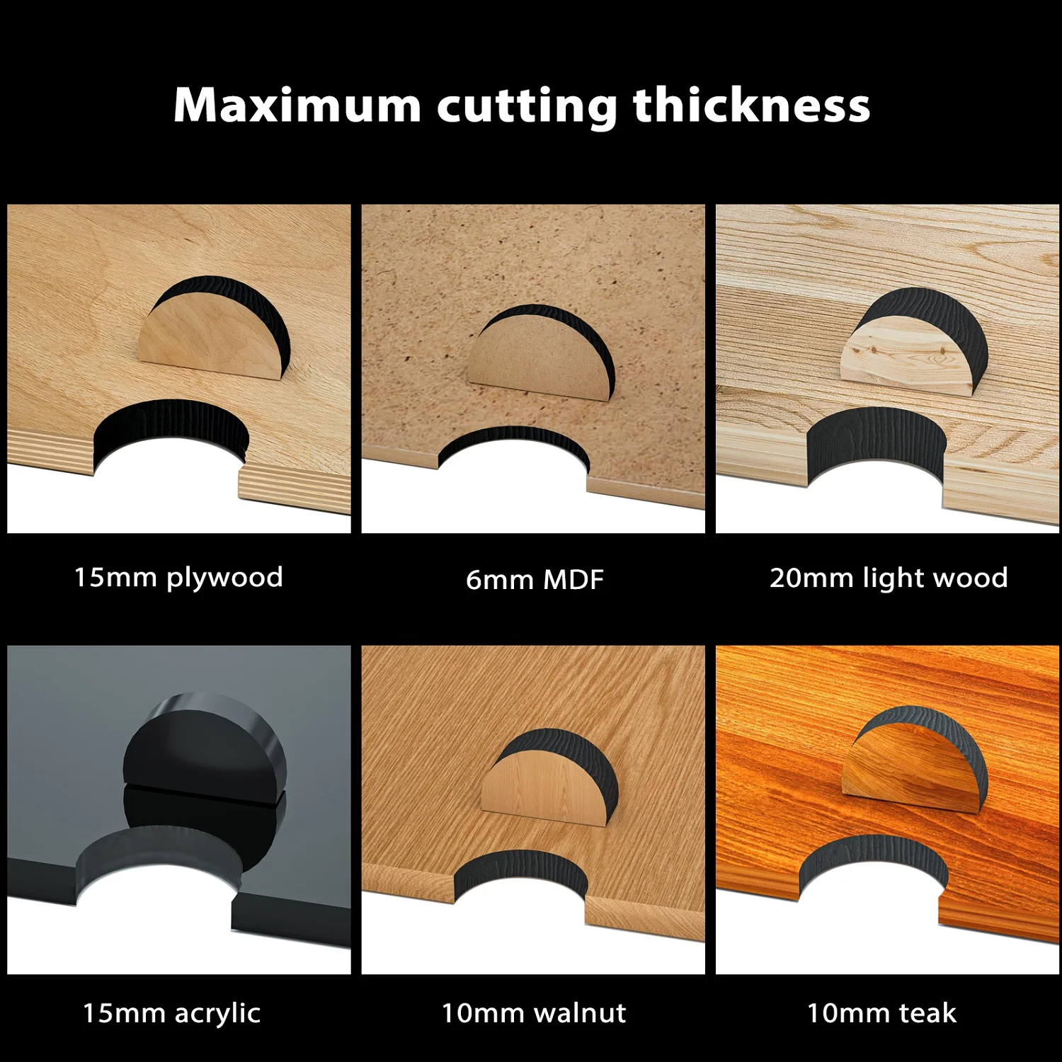 Pode cortar 15mm madeira compensada por uma passagem, 8mm acrílico preto por uma passagem.