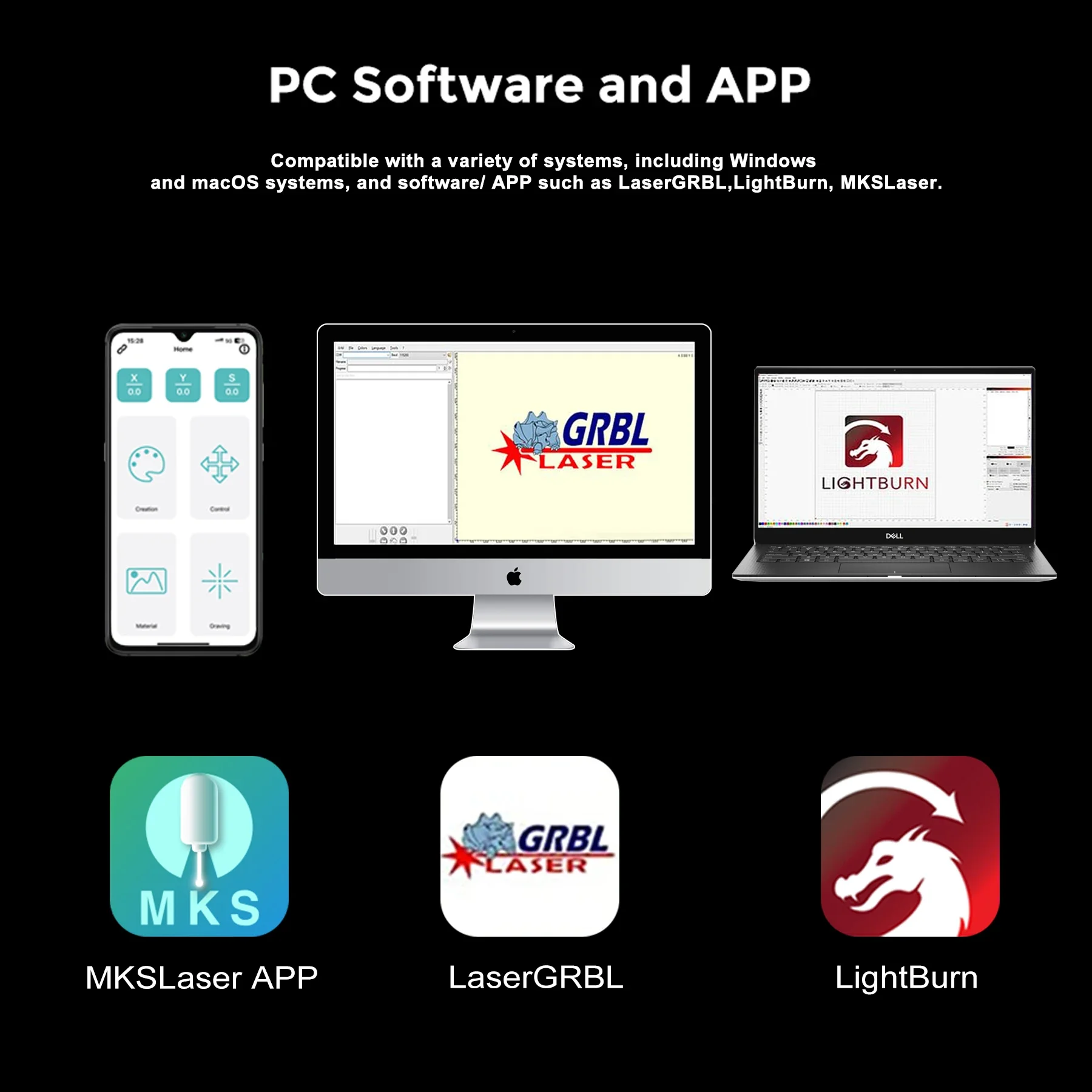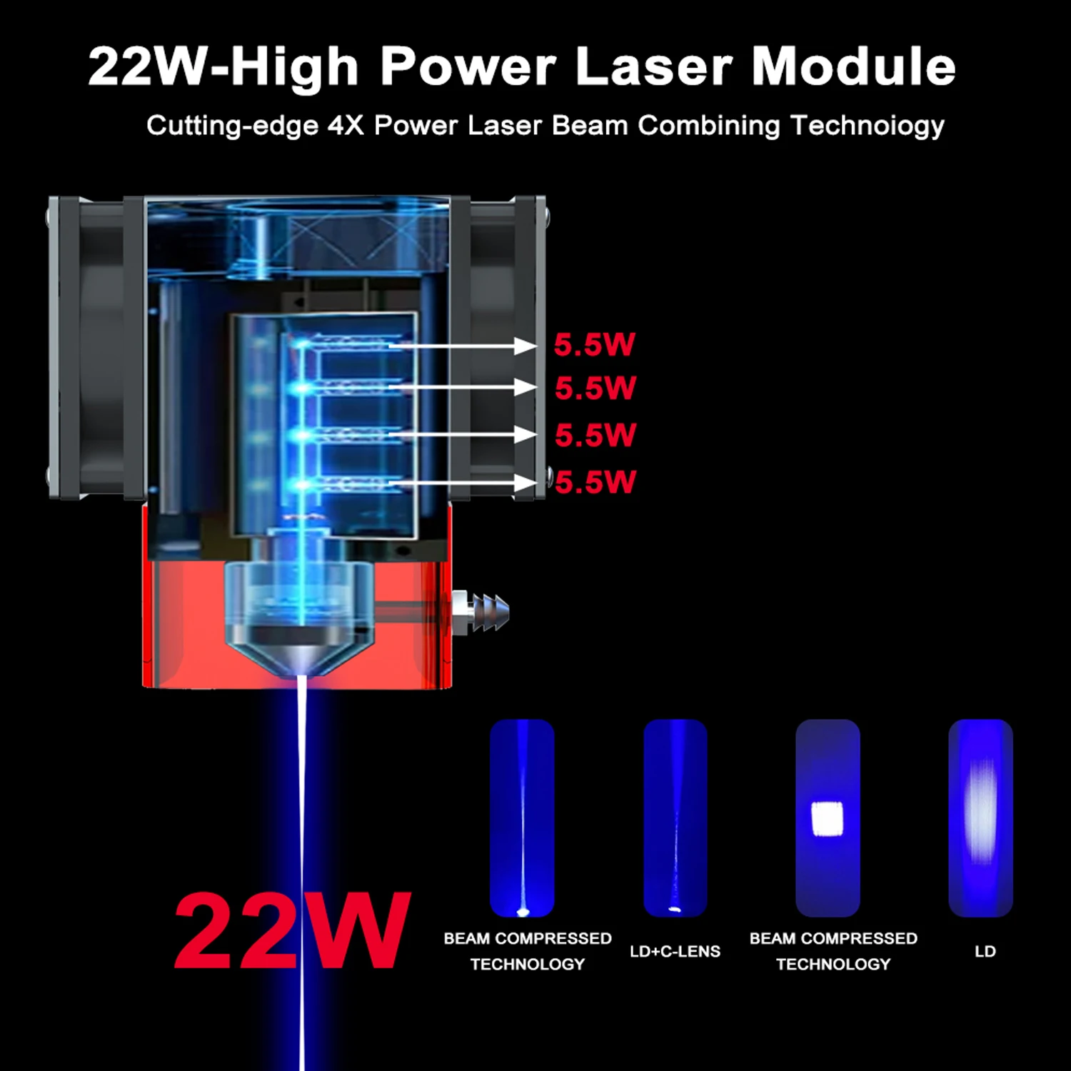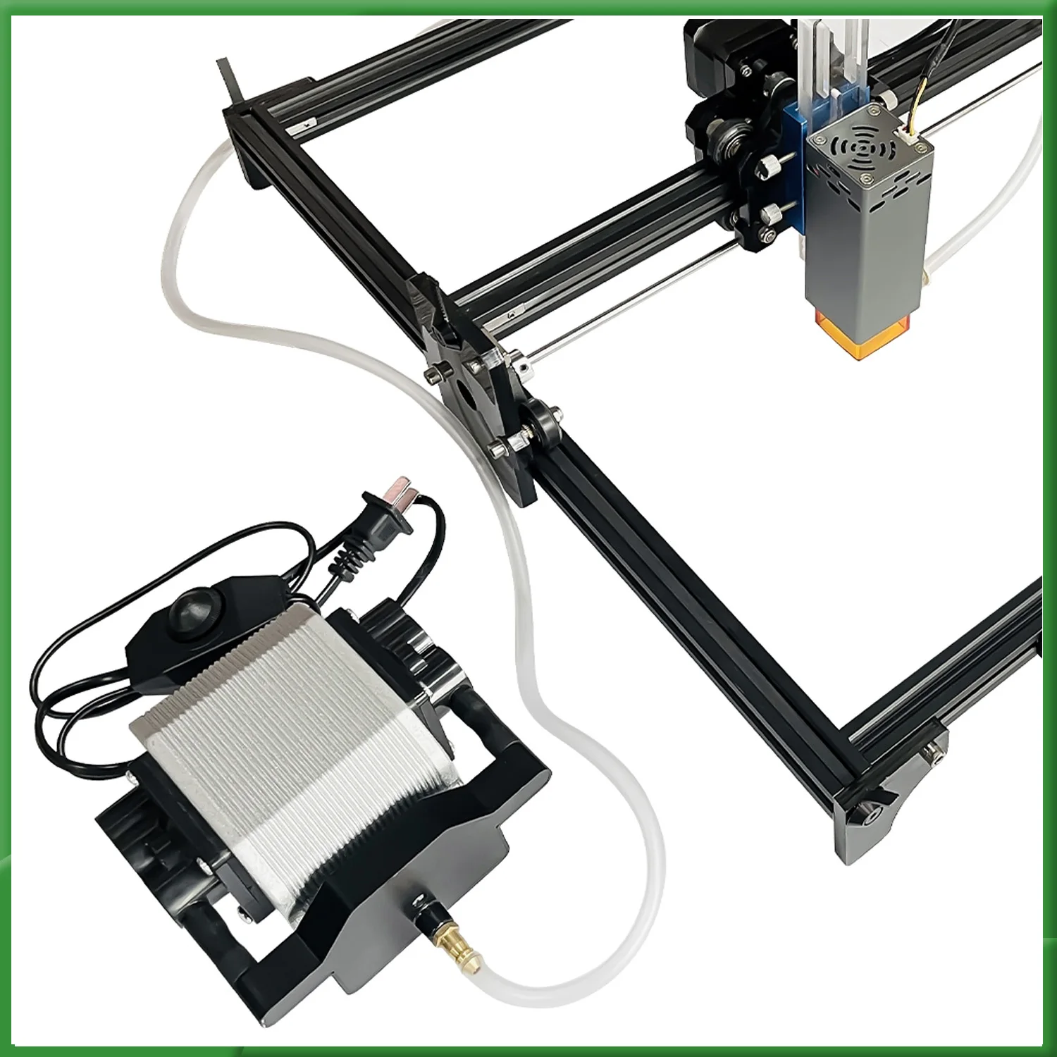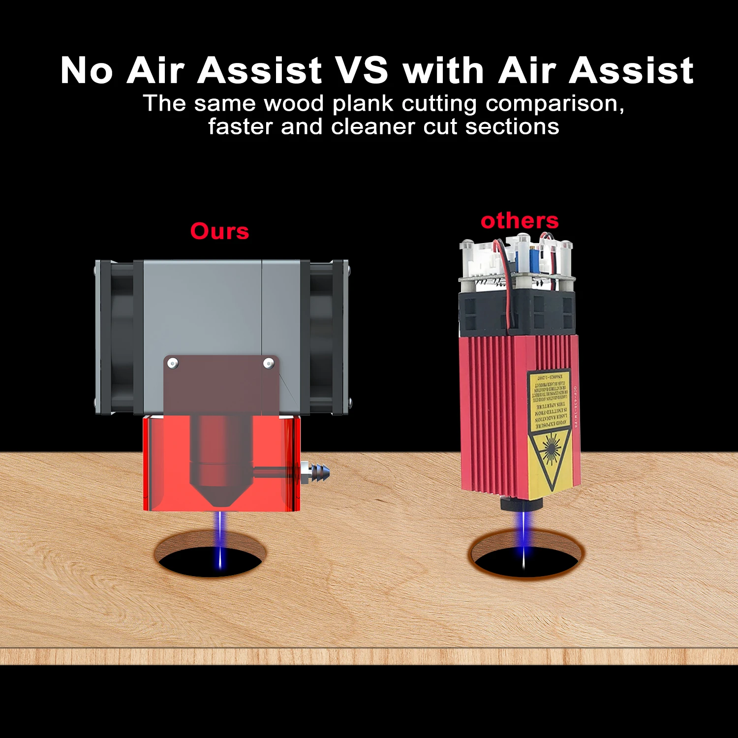 Velocidade do fã 12000rpm, boa dissipação de calor, apropriada para o trabalho a longo prazo, protege o motorista do laser, vida útil prolongada do módulo do laser.3. Com Air-assist: Soprando através do bocal do ar, que melhora o desempenho do corte e reduz marcas da queimadura, faz a gravação e o corte mais precisos, protege a lente do módulo.